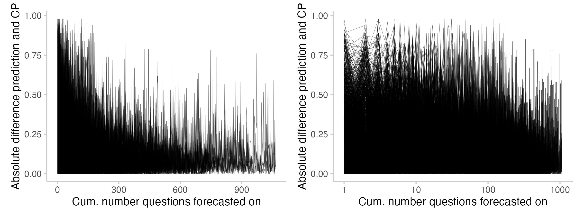 It seems like users tend to predict closer to the CP as they forecast more. It also seems like (maybe?) there are fewer instances where users predict exactly the CP. I'm not entirely sure about that though - the plot might be a bit misleading, as there are fewer lines for users who forecast on 900 questions than for those with 50.