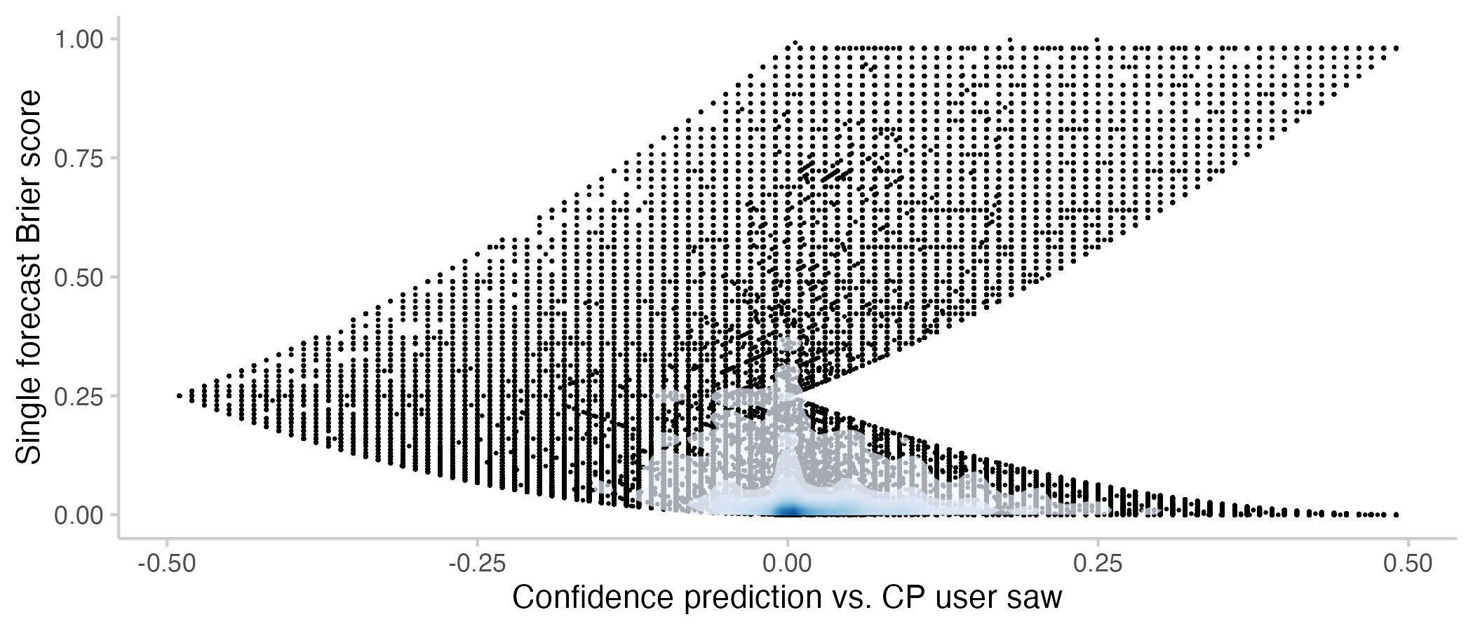 Figure 10: User Brier score vs. how confident a prediction was relative to the CP that the user saw. Note that the Brier scores here are different from the ones used throughout the rest of the post: Points show Brier scores for a single forecast made by a user. If a user makes three forecasts one a single question, this will show up as three dots. In all other plots, Brier scores are a single time-weighted score for the entire activity of a user on a question (including all forecast updates). The shade overlayed shows the density of observations- blue means there are a lot of observations, white means there are not so many observations.