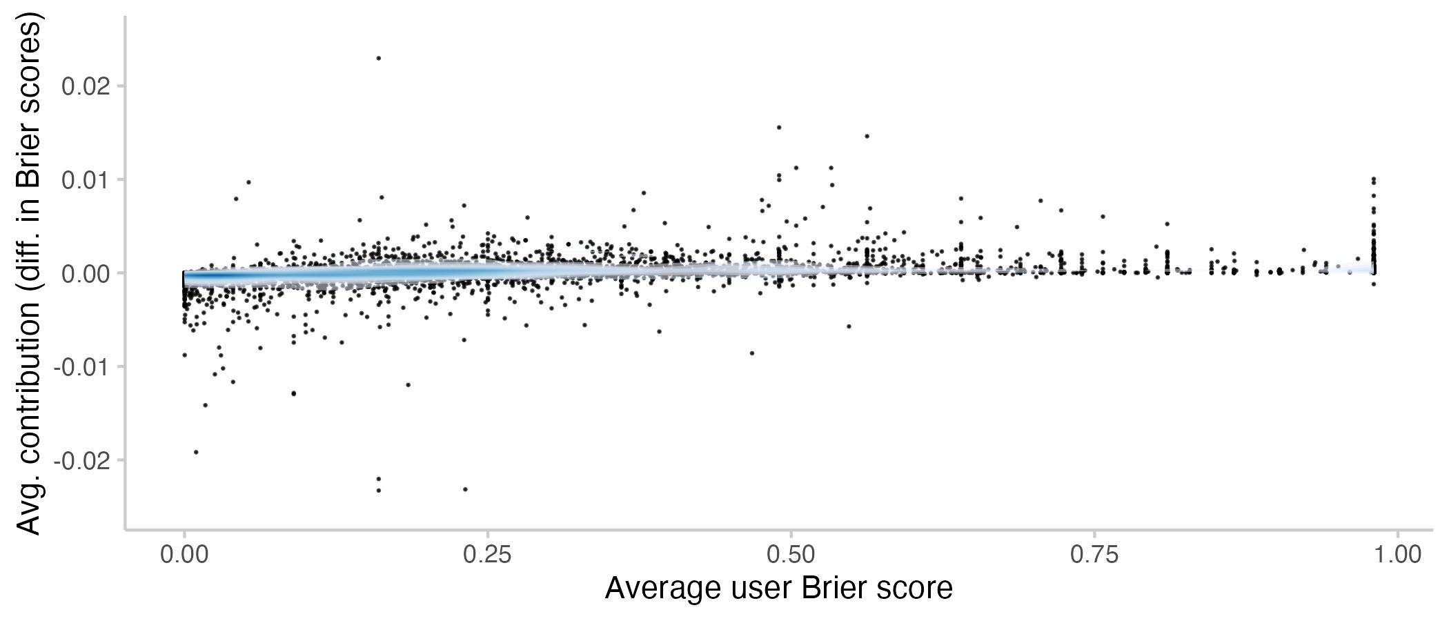 Figure 5: Average contributions to the CP by a user vs. their average Brier score. Lower means better. Every point represents a single user. The shade overlayed shows the density of observations- blue means there are a lot of observations, white means there are not so many observations.