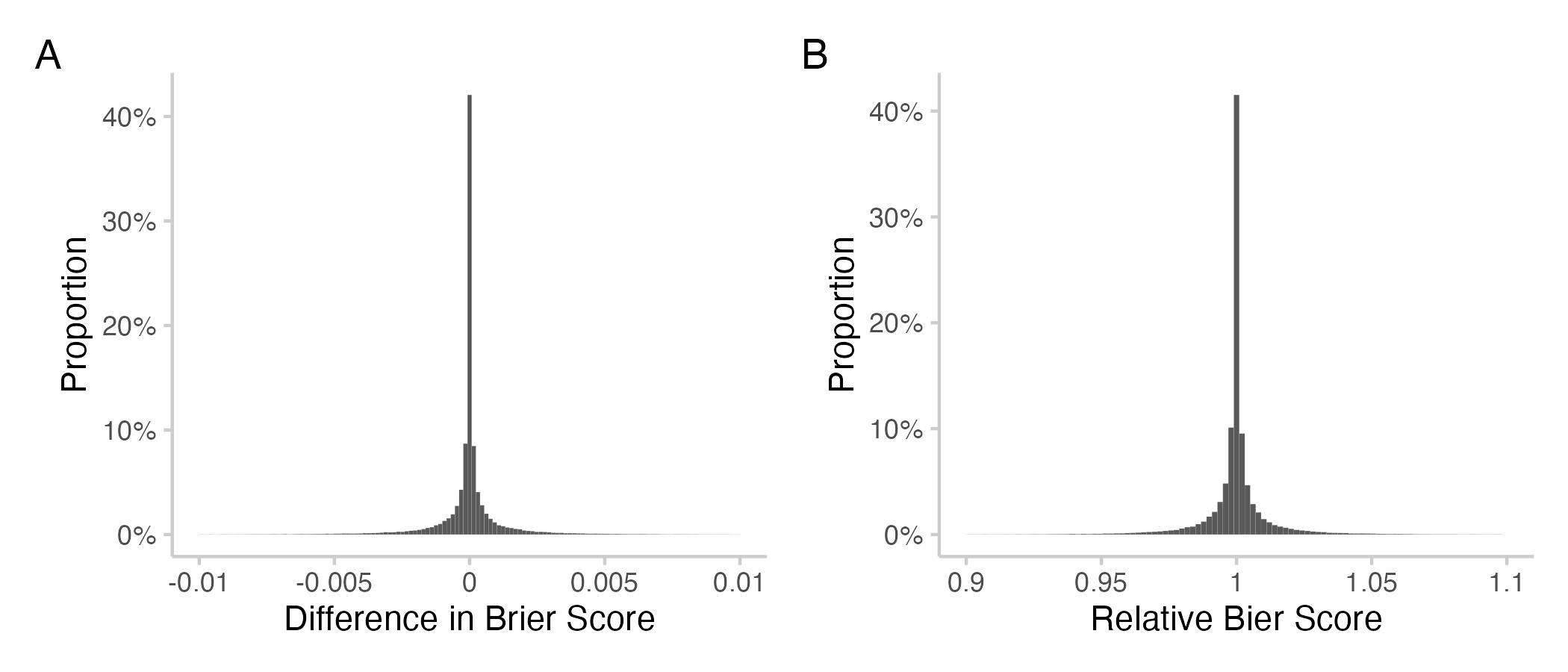 Figure 1: Histograms showing an overview of all individual contributions for all users across all questions. A: Differences in Brier scores (Brier score of CP with user included - Brier score without that user). Negative means improvement. B: relative Brier scores (i.e. ratio of Brier score for the Community Prediction with the user included over the Community Prediction without that user). Values smaller than 1 mean an improvement.