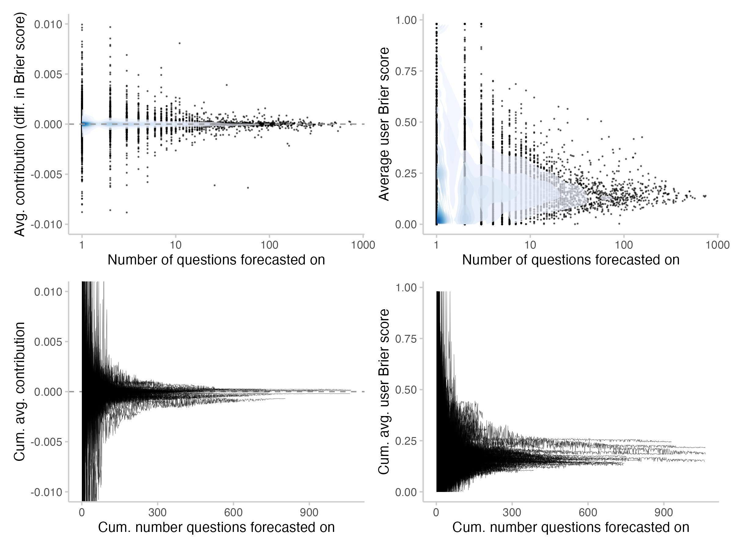 The following plot shows average contributions, as well as average Brier scores per user as a function of the number of questions they forecast on. The top row shows the average (every point represents a single user), whereas the bottom row shows the cumulative average, i.e. the development of the average over time (every line represents a user).