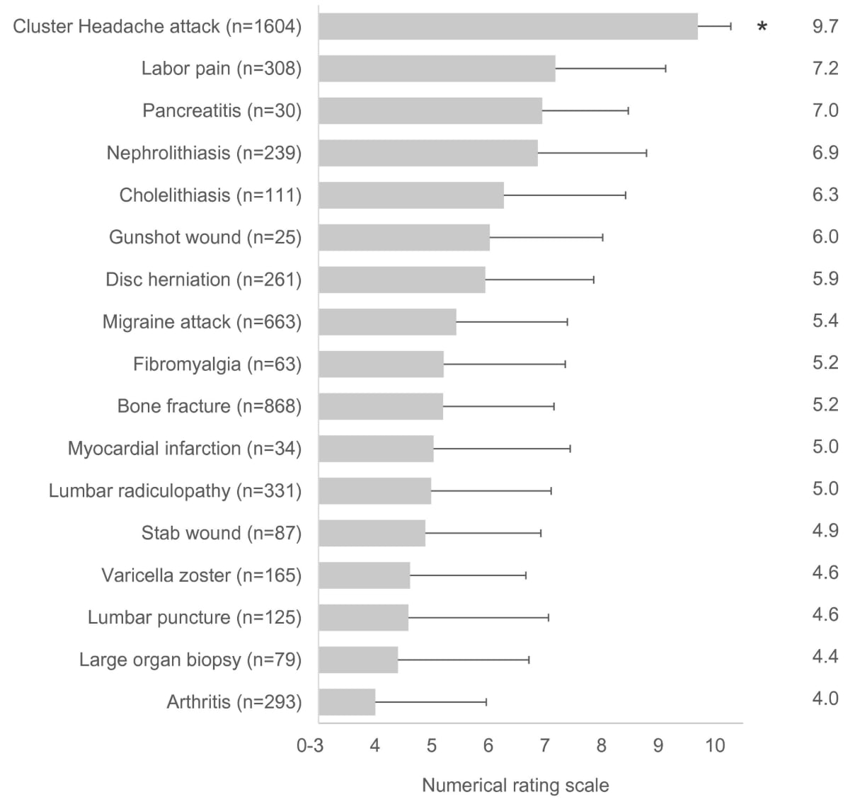The most compelling evidence for Dr. Ran’s quote above comes from a 2020 survey of cluster headache patients by Burish et al., which asked patients to rate cluster headache pain from 1–10 as well as other very painful conditions they themselves have had. Cluster headache attacks were rated as significantly more painful than other severely painful conditions: