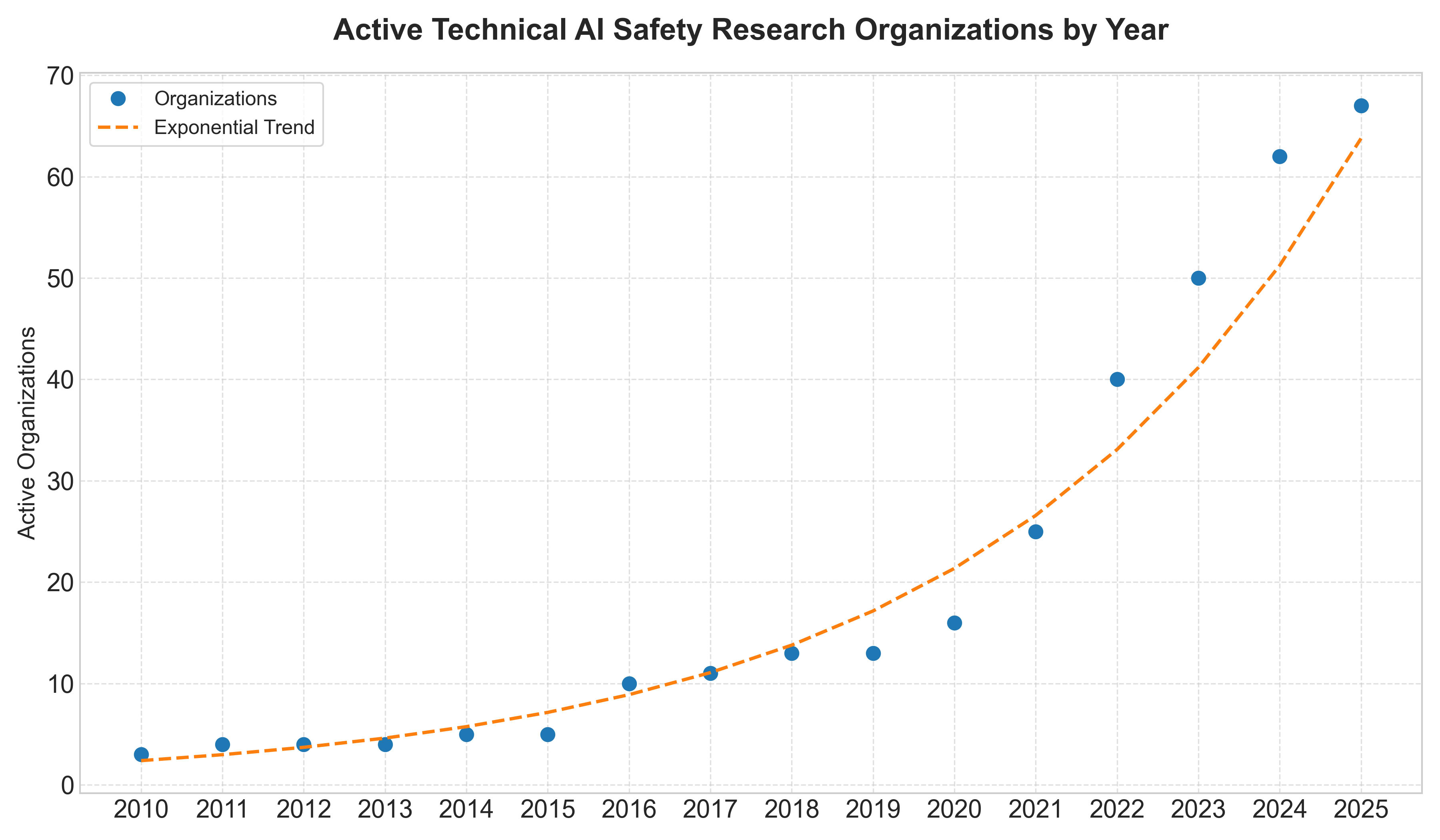 The two graphs show relatively slow growth from 2010 to 2020 and then the number of technical AI safety organizations and FTEs starts to rapidly increase around 2020 and continues rapidly growing until today (2025).