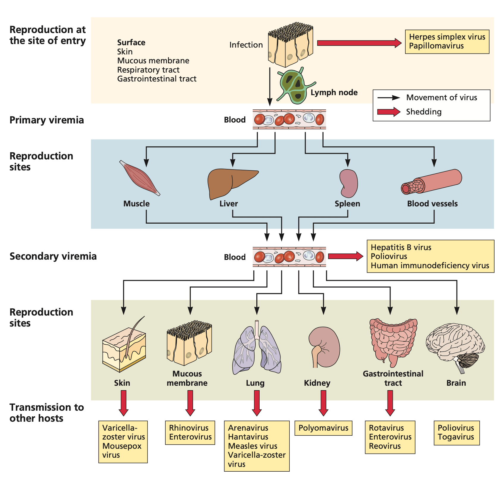 Figure 2: Entry, dissemination, and shedding of viruses in the bloodstream. Adapted from Flint et al. (19), Principles of Virology, 5th Ed., 2020. Reproduced with permission from John Wiley & Sons via Copyright Clearance Center.