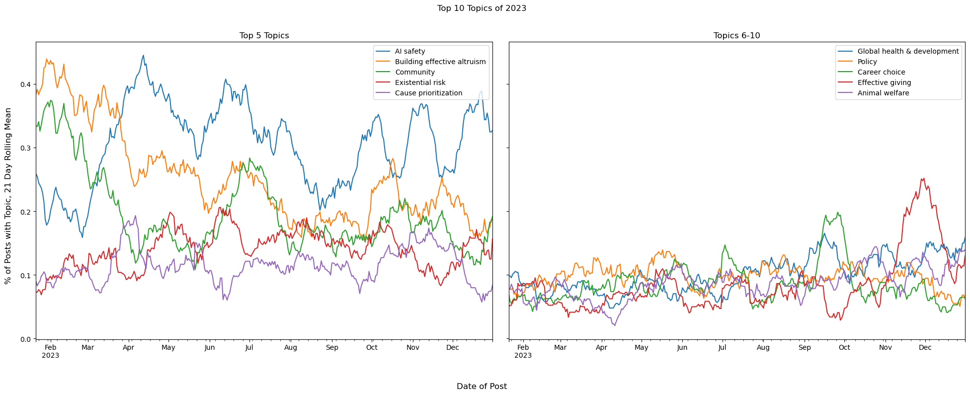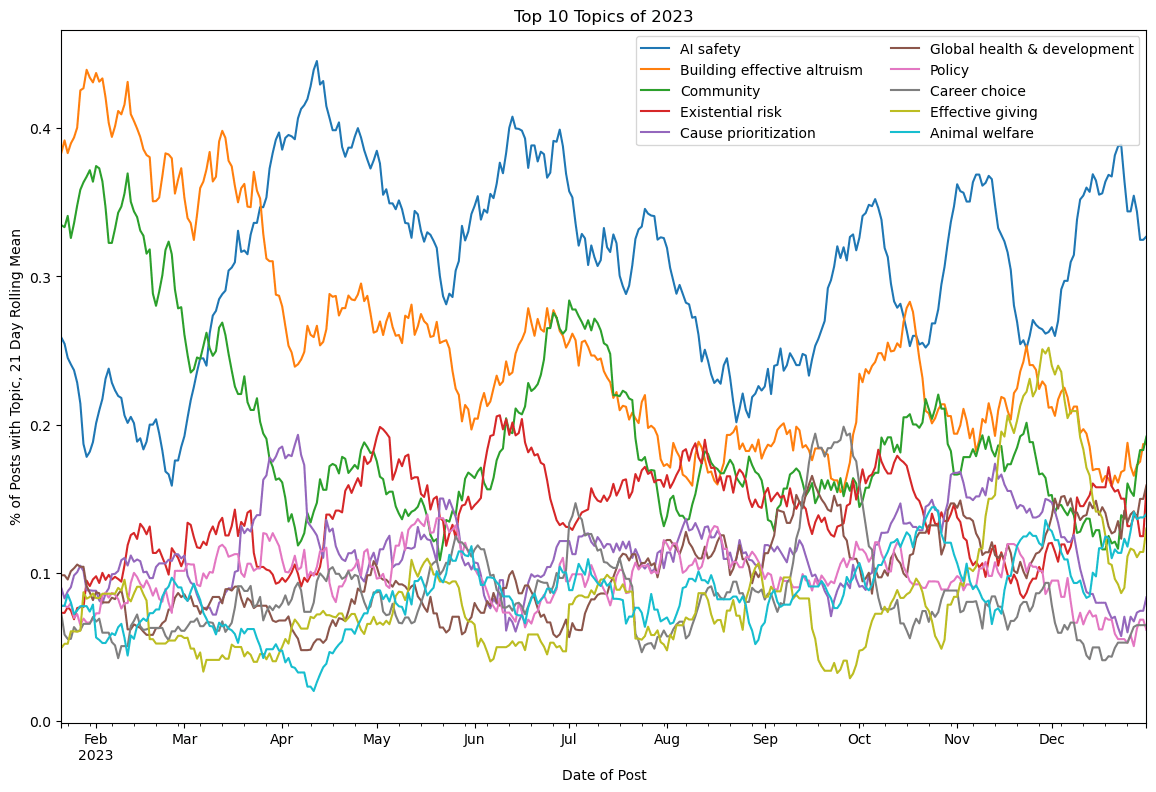 The primary reason I set out to do this was to look at the main topics that the Forum discussed over 2023, how that changed over time, and what this can tell us about the state and trajectory of the movement.