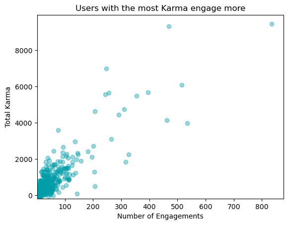 This trend continues when we add Karma into the mix. Most Forum uses engage a small number of times, and accumulate a small amount of Karma. Some, however, post extensively and gain lots of karma as well:
