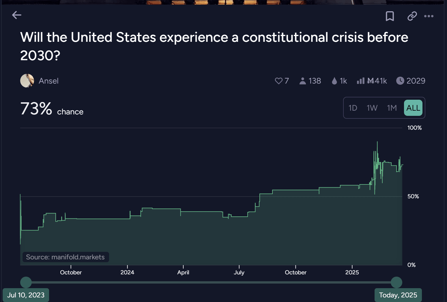 Manifold is now at ~ 3:1 odds expecting a constitutional crisis in the US before 2030, up from ~1.5:1 odds around Inauguration Day and ~ 1.2:1 odds after Election Day: