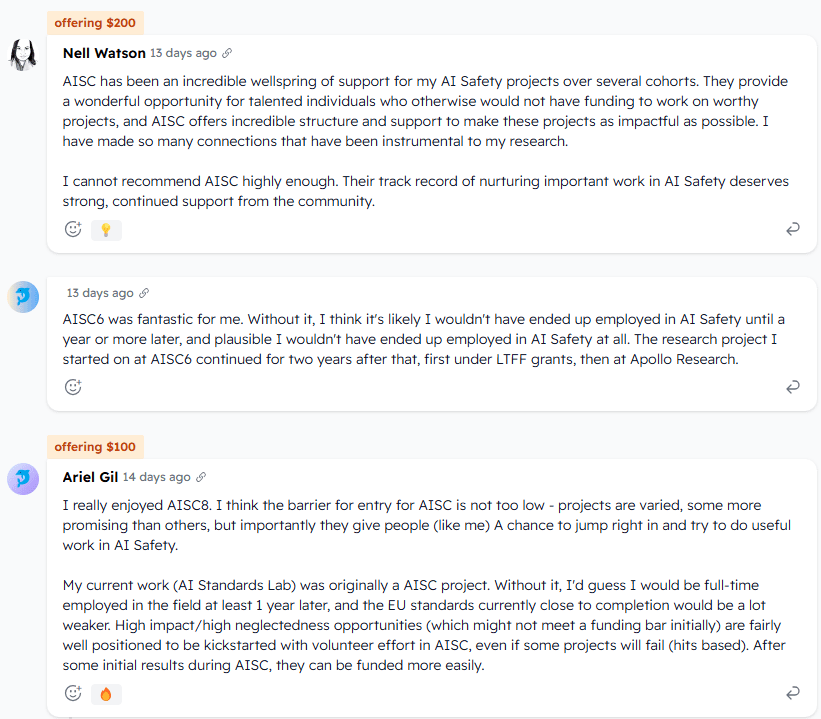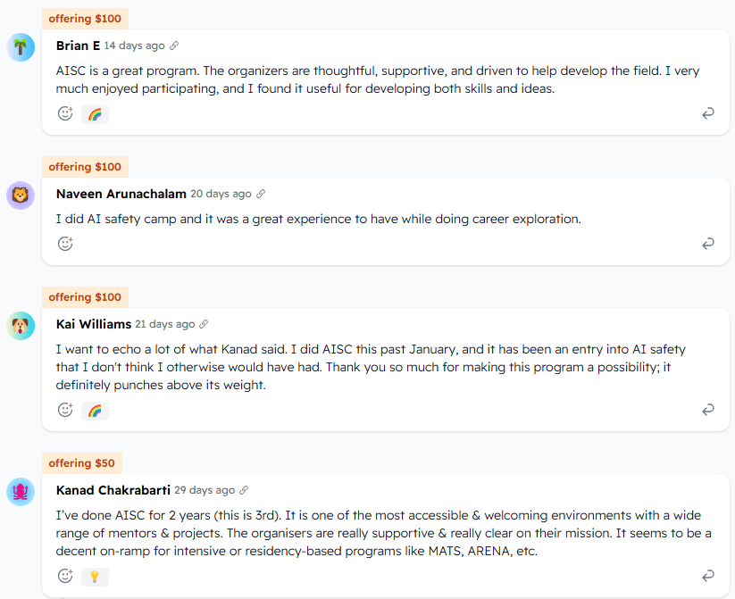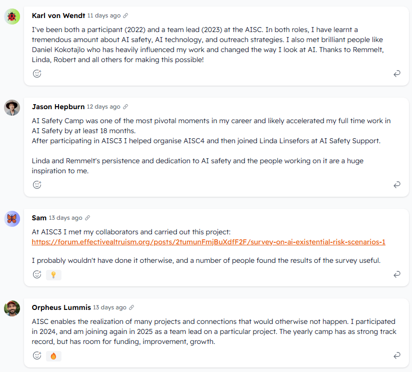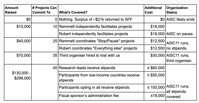 If we don't get funded for this time, there is a good chance we will move on to different work in AI Safety and new commitments. This would make it much harder to reassemble the team to run future AISCs, even if the funding situation improves.