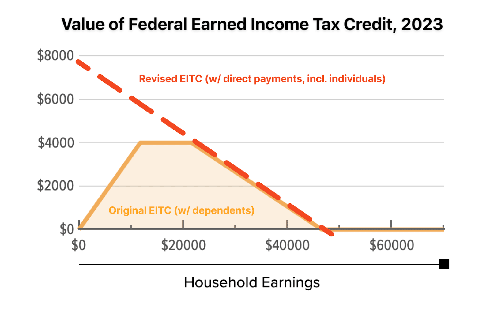 - Expand the EITC to provide a greater tax credit for individuals without dependents (currently max $600). That is, shift the EITC to also prioritize reducing poverty for individuals, not just families.