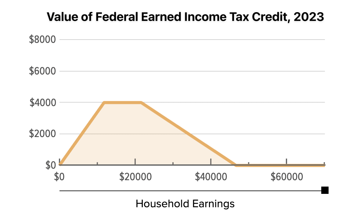In essence, the EITC is a negative income tax for low to middle-income Americans that provides primarily tax credits, not direct payments. That is, it provides no additional income for the unemployed, but reduces taxes conditioned on participation in the labor force. You can see how it works in this diagram:
