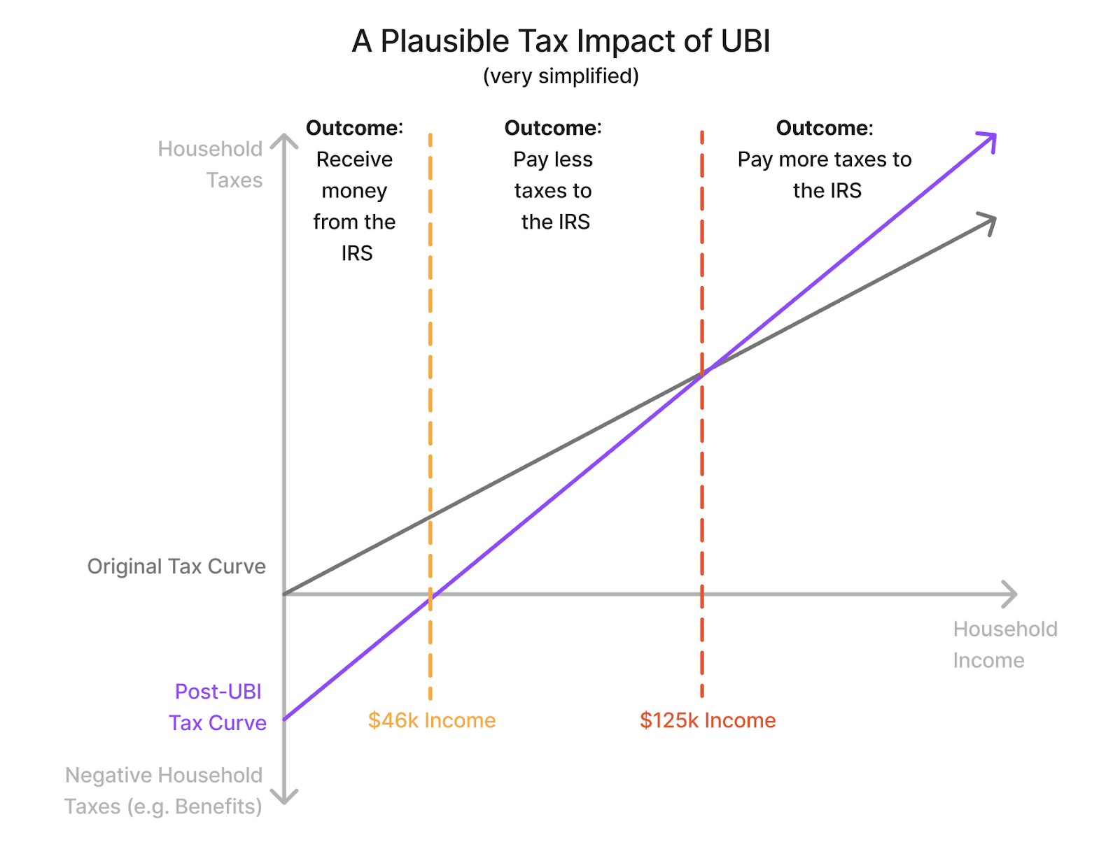 Below ~$46k[10]: you’d receive a recurring check from the IRS for $12,000 minus your personal taxes. At $46k, you’d pay roughly $0 net taxes.