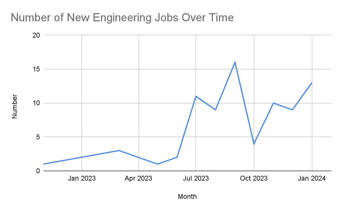 Although the data is a little spiky due to the likely manual and sporadic nature of finding jobs for the 80k job board, it still indicates that there was a significant increase in engineering job postings from <5 per month before July 2023 to around 10 per month from July 2023 onwards. The trend has remained high since, and I expect that this will continue to be the case (if not increase over time).
