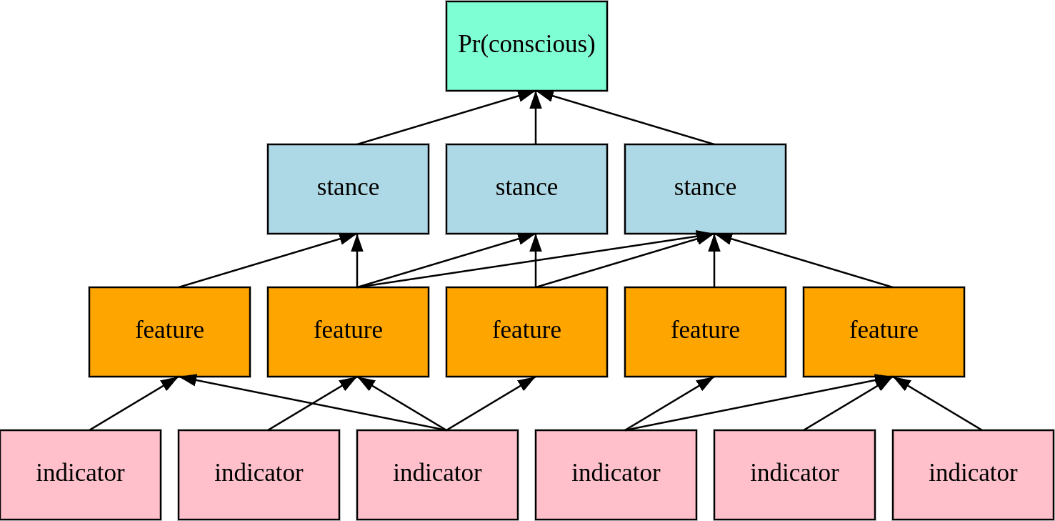 Our model is broadly Bayesian. Features raise or lower the probability of consciousness via their likelihoods: for any given stance, how much would we expect to see these features in a system if the system is conscious versus unconscious? Indicators raise or lower the probability of features in the same fashion: if we assume the feature is present (or absent), what does that tell us about the probability of the indicator? Bayesian probability theory makes it easy to update on new evidence in light of such likelihoods.