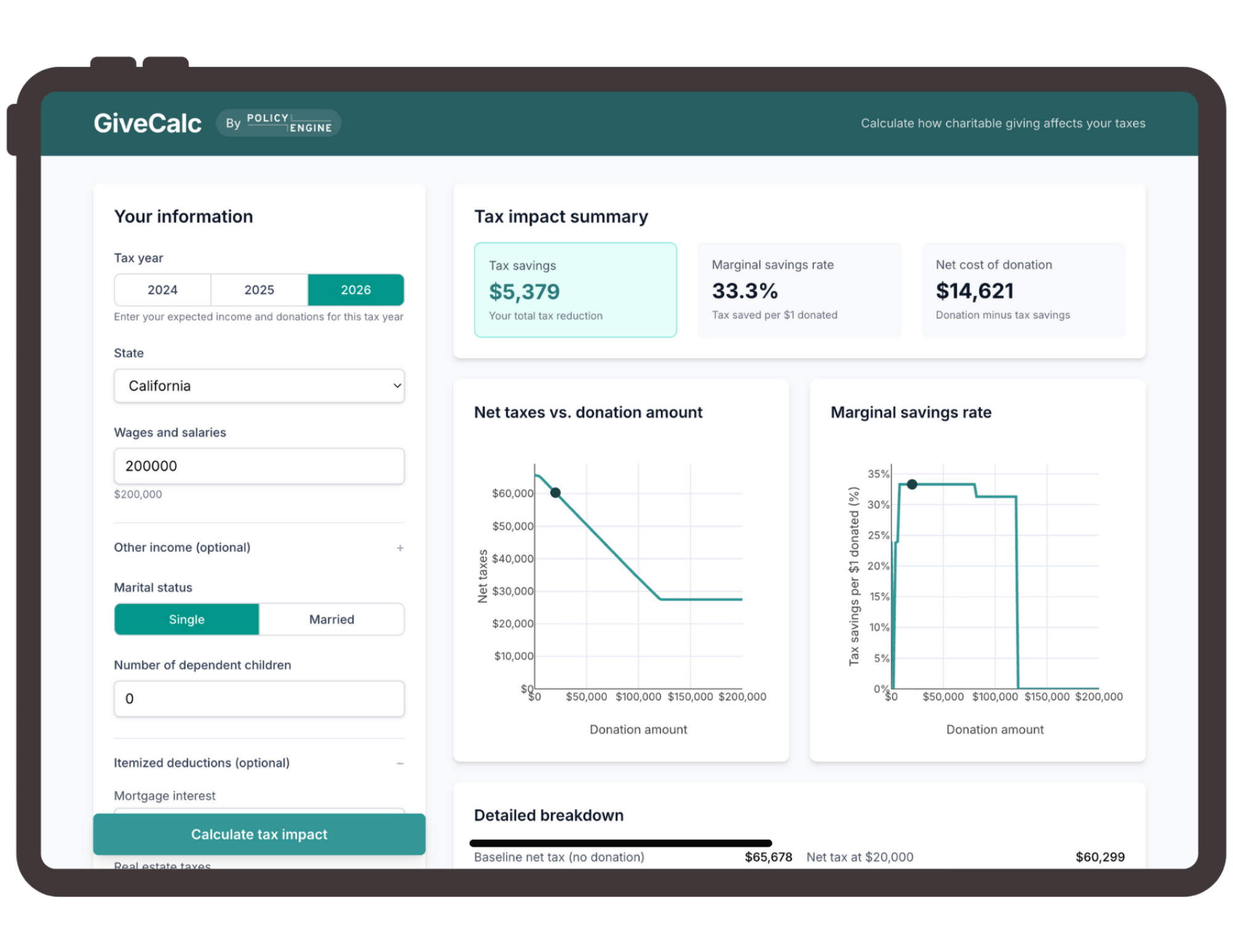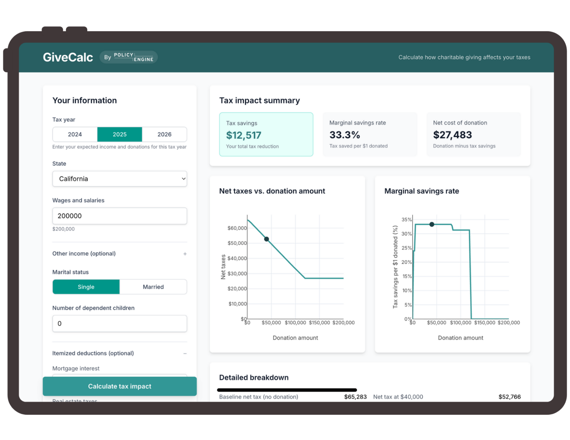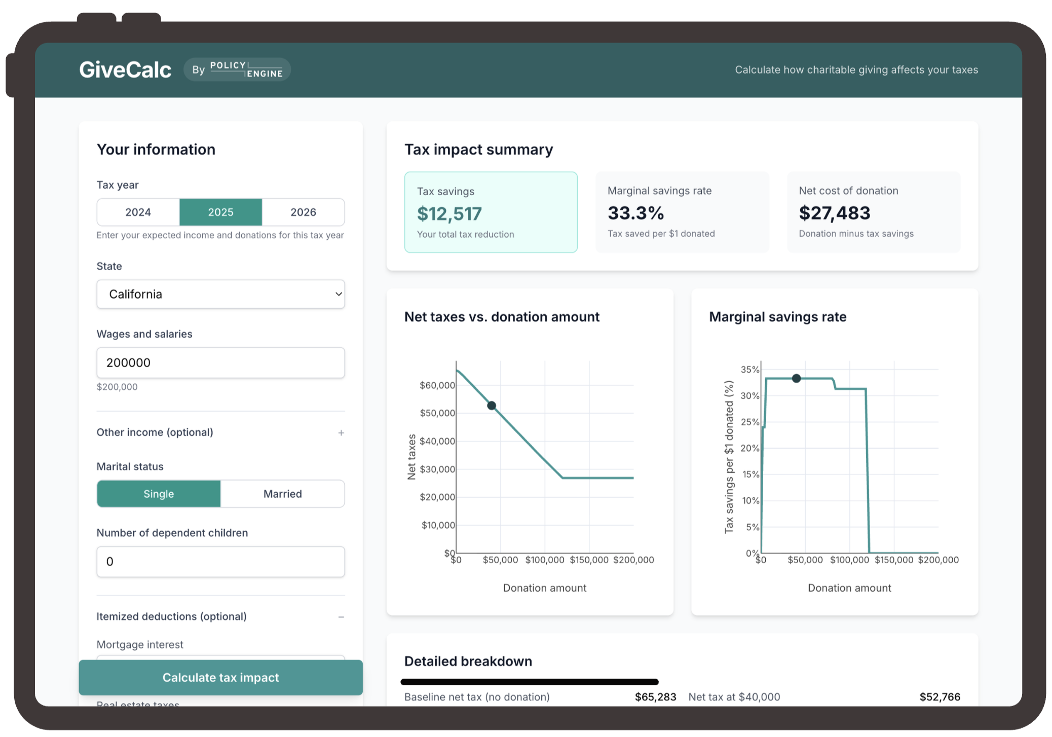 GiveCalc is built by PolicyEngine, a 501(c)(3) nonprofit (US) and registered charity (UK, no. 1210532). We build open-source tax-benefit simulation models used by congressional offices, think tanks, and researchers for evidence-based policy analysis.
