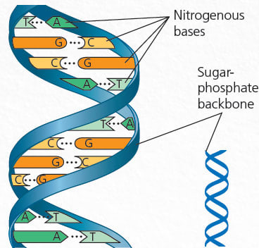 The primary genetic material in a cell is DNA, which is made up of two complementary strands of 4 types of nucleotides: A, C, T, G. The two strands are complementary in that A pairs with T and G with C, which makes DNA look like the following figure.