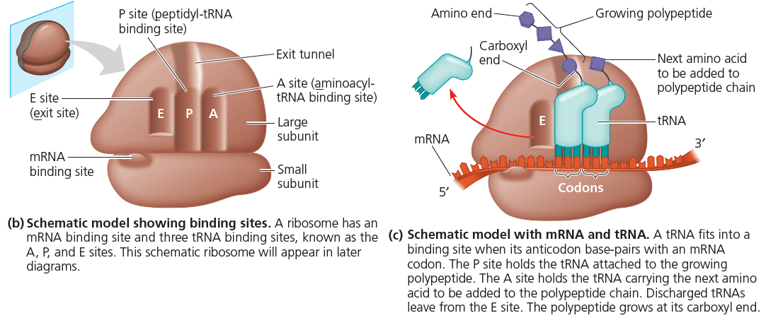 Ribosomes are made up of ribosomal proteins and rRNA, ribosomal RNA. Translation of mRNA to polypeptides happens in the following way: there are so-called tRNA, transfer RNA, that have an anticodon loop which identifies a codon on the mRNA, and they bind to a particular amino acid at another site. These tRNA (carrying amino acids with them), assemble in the ribosome and allow the entering amino acid to make a chemical bond with the chain of previous amino acids. Once this bond is formed, the tRNA bonded to the immediately previous amino acid breaks its bond and exits the ribosome. Once the last amino acid has been added to the chain, a stop codon terminates translation and the polypeptide is released. The following figure provides a helpful visualisation: