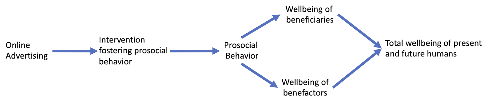 As proof of concept, we applied the general method described in the previous post to predict how cost-effective it would be to scale up an existing intervention for promoting prosocial behavior (Baumsteiger, 2019) via online advertising. Baumsteiger (2019) developed an online intervention for fostering the development of a prosocial identity and prosocial habits in high school and college students. The first part of this intervention combines information on the benefits of engaging in prosocial behavior for one’s own well-being with an elevating video. The second part guides participants to reflect on what they are grateful for, who inspires them, what they value, who they want to be, and how they would like to make the world a better place. In the second part of the intervention, participants are guided to formulate concrete plans for how to help other people on each of the following ten days. In the third part of the interventions, participants execute those plans and write about what they did to help others and how this prosocial behavior affected their well-being and the well-being of others.