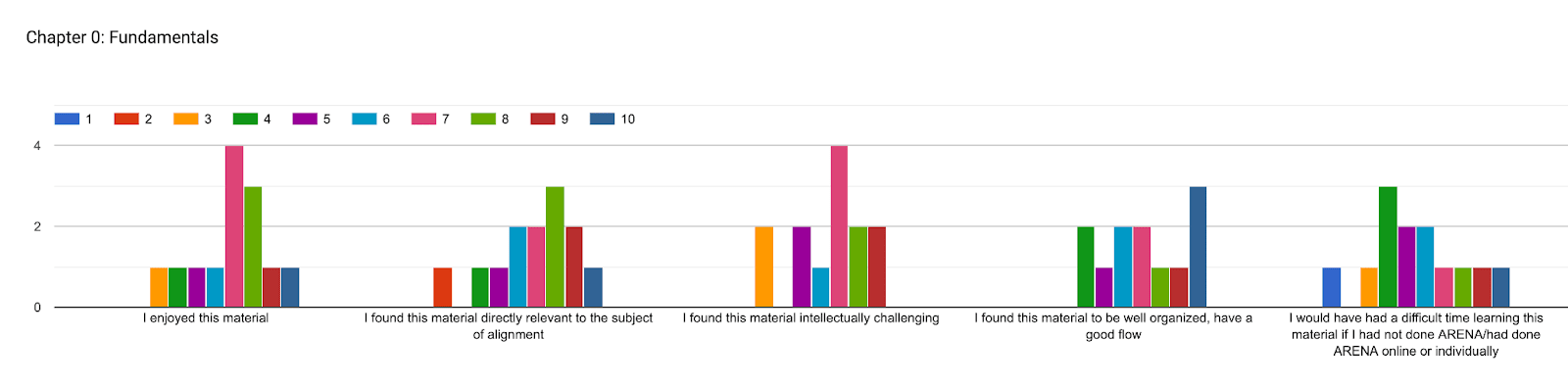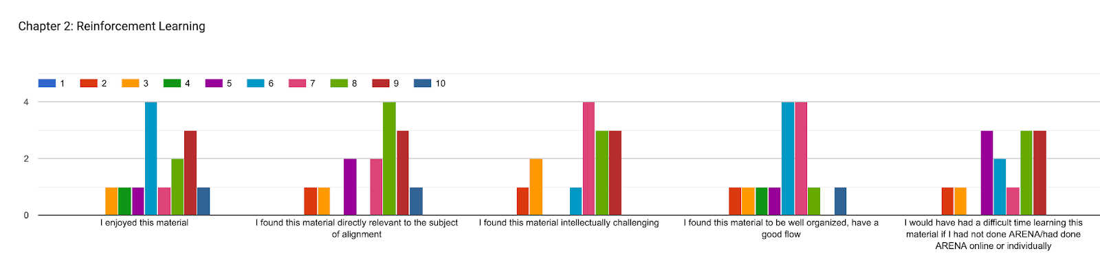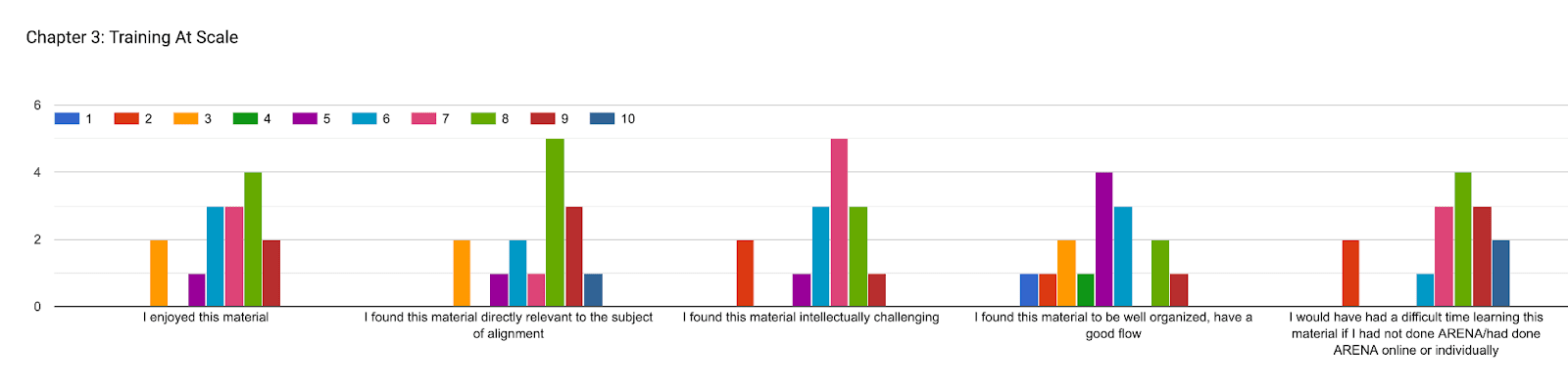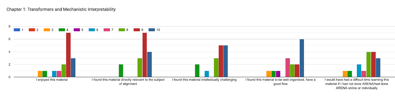 In each of the questions below, participants were asked to rate how much they agreed with each statement, on a scale from 1 to 10. Responses were positive overall (especially for chapter 1: transformers & mechanistic interpretability), but with room for improvement in the chapters on reinforcement learning & training at scale.
