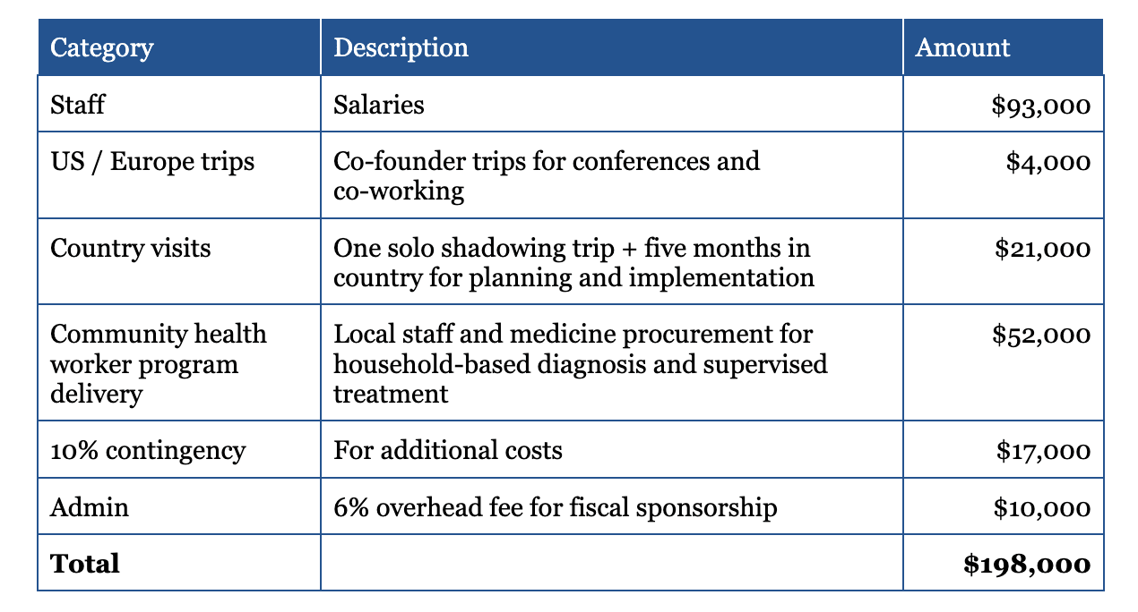 The major components of our first year budget are co-founder time, country visits, and delivery of a pilot program, which aims to do household-level TB screening and provision of preventative medication.