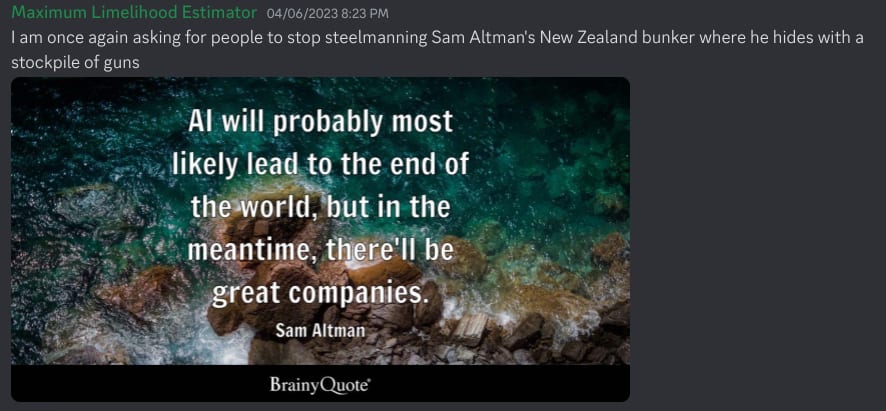 I would like to state, for the record, that if Sam Altman pushes a "50% chance of making humans extinct" button, this makes him a bad person, no matter what he's thinking to himself. Personally I would just not press that button.