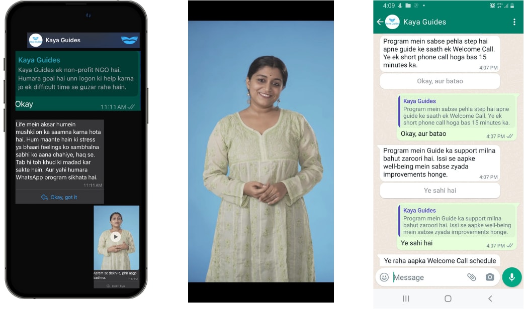 - How it works: A WhatsApp chatbot delivers videos in Hindi that teach participants evidence-based techniques to reduce depression. Participants practice the techniques day-to-day and have a 15-minute weekly call with a trained supporter for 5-8 weeks