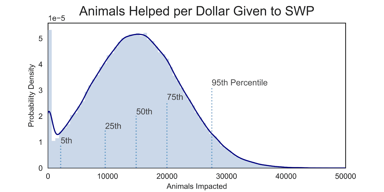 The number of shrimp stunned per dollar was estimated based on SWP’s “back-of-the-envelope calculation” included in the Manifund description. This information is provided in Table 2. I translated SWP’s calculations into a probability distribution by assuming that the number of shrimp helped per dollar was normally distributed with mean equal to SWP’s estimate (14796) and standard deviation equal to the average difference between the number of shrimp helped per dollar at each producer and the total average (7708). The lower end of this range might represent SWP encountering unexpected challenges that prevent the stunners being fully successfully utilized, while the upper end of this range might represent the stunners being successfully used (and having counterfactual impact) for more than the three years baselined in SWP’s analysis. This distribution is shown in Figure 4.