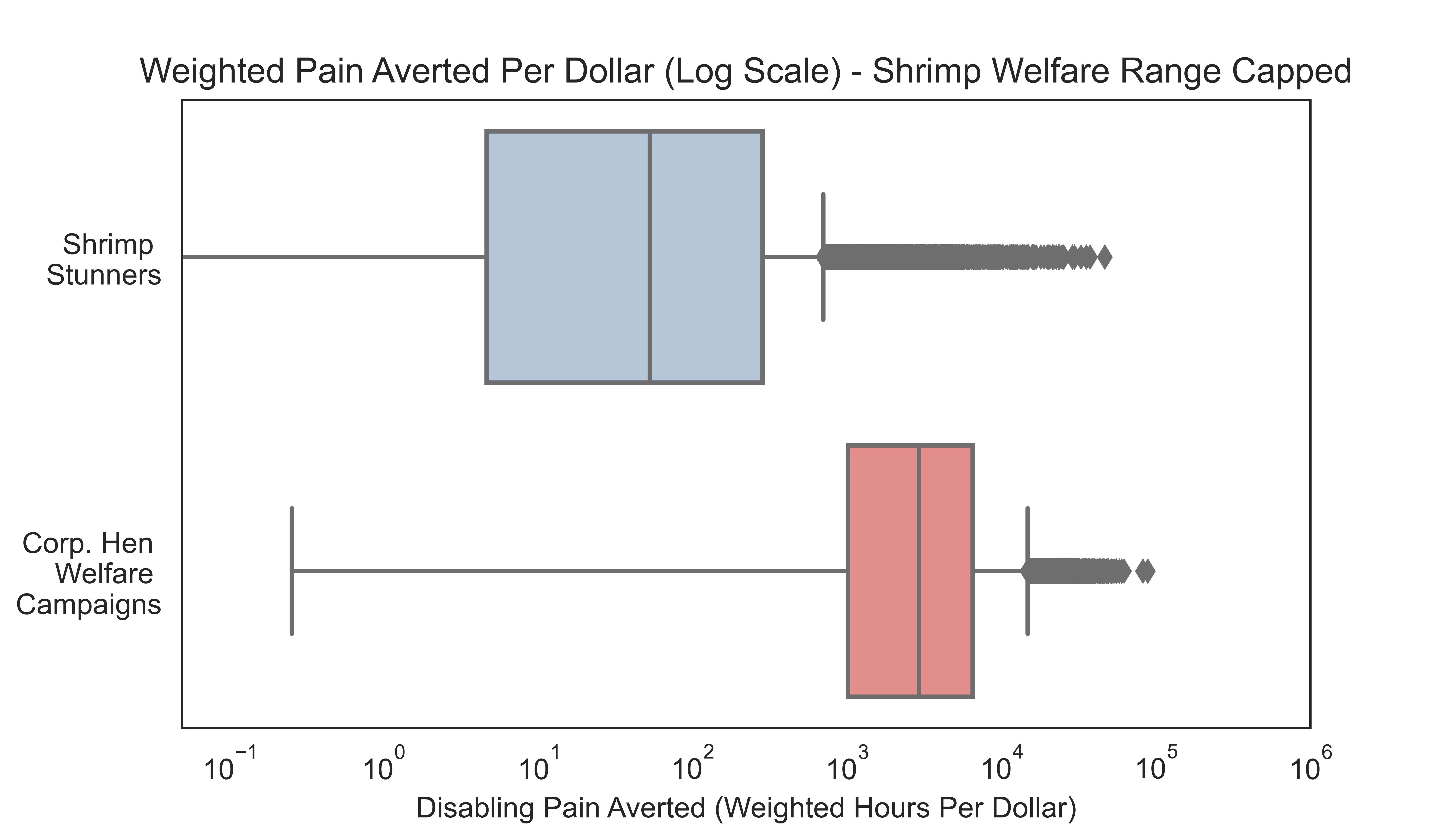 In light of item three, one might reasonably argue that this intervention constitutes something of a Pascal’s mugging, in that a large share of the impact is driven by a small number of relatively unlikely extreme cases. Most but not all the impact is driven by these cases—capping shrimp’s welfare range at 0.1x that of a human drops the mean cost effectiveness by about a factor of 5. This is still much greater than the 5th-percentile estimate of corporate hen welfare campaigns’ cost-effectiveness, but is low enough as to appear relatively uncompetitive with corporate campaigns in expectation. Potential donors should think carefully about their risk tolerance, credence in the undiluted experience model of welfare, and willingness to make hits-based bets when considering this initiative.