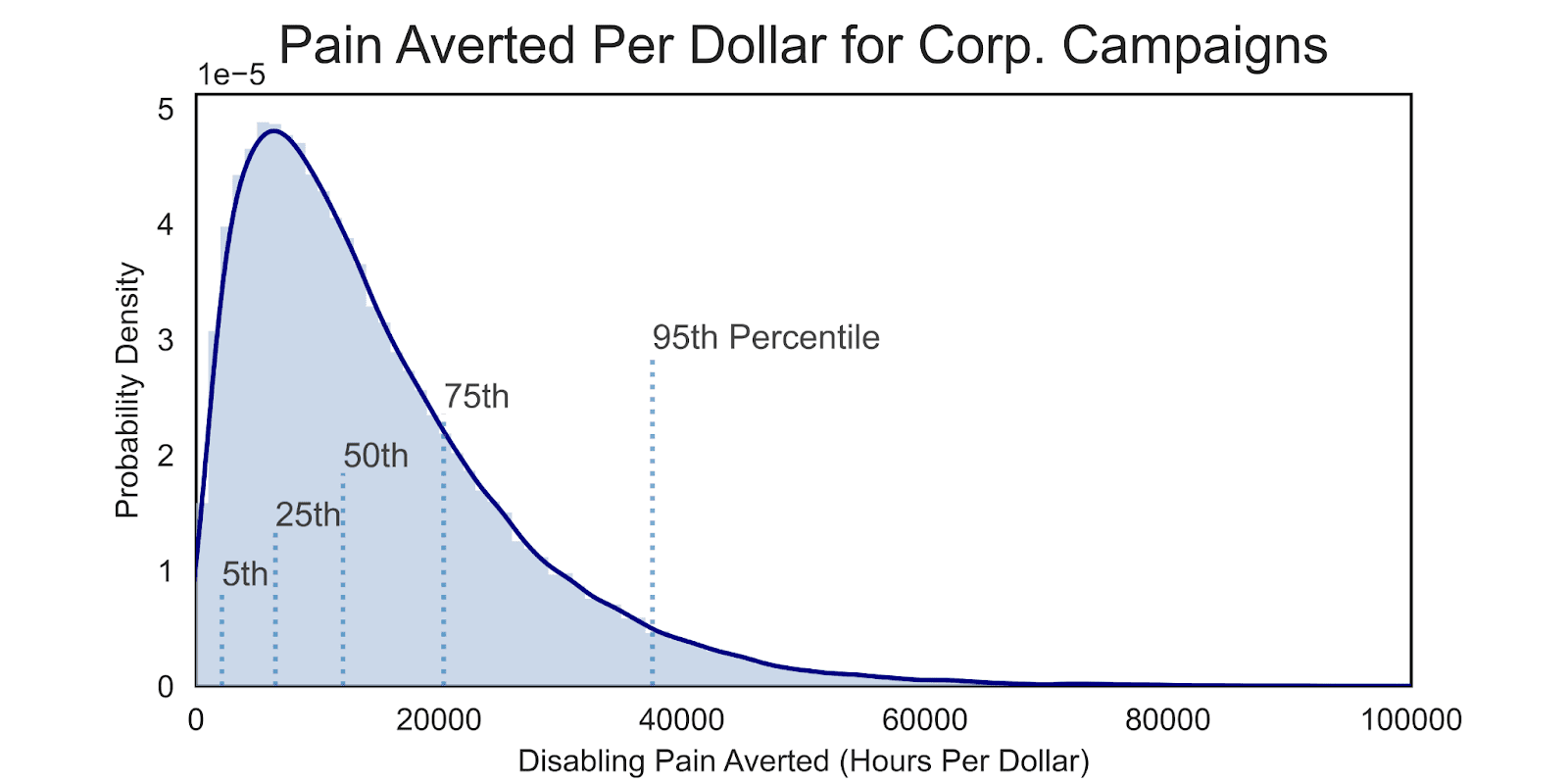 My estimate of hours of disabling pain averted per dollar spent on corporate chicken welfare campaigns comes from Duffy (2023). The report estimates that corporate welfare campaigns have averted 1.7 years of disabling-equivalent pain per dollar spent, with a 95% confidence interval from 0.23 to 5.0.[1] I approximated this result as a gamma distribution with ɑ = 1.7 and β = 1, multiplied by (24*365) to convert to hours per dollar. This distribution is shown in Figure 5.
