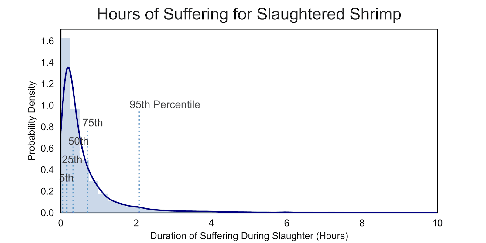 The duration of suffering during slaughter is currently an area of significant uncertainty for me. Based on SWP’s “minutes / hours” statement, I estimated the distribution of suffering during slaughter as a lognormal distribution with a mean of 20 minutes and a 97.5th percentile estimate of 3 hours. This distribution is shown in Figure 3.