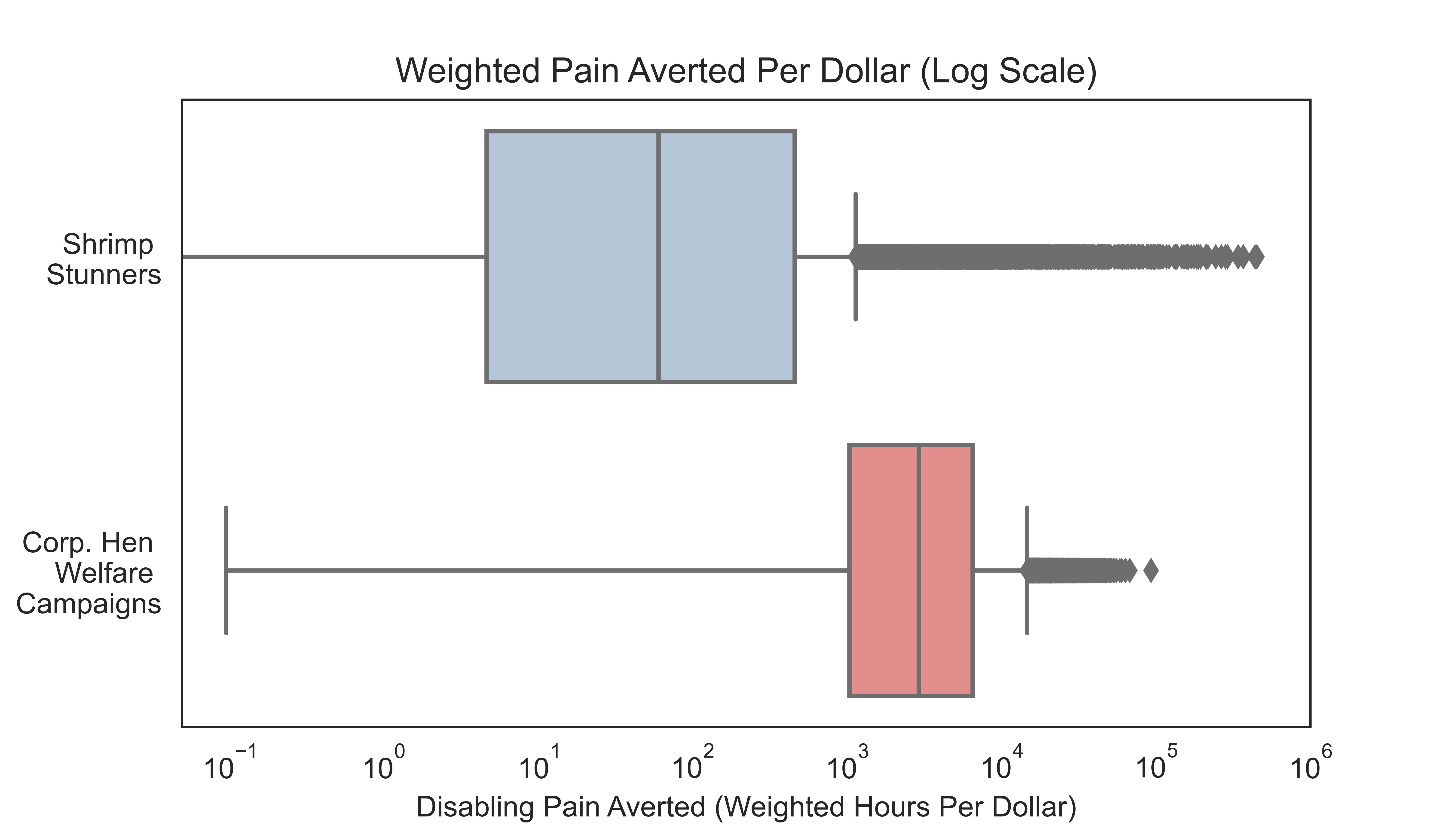 The metric of interest in this analysis was welfare-range-weighted hours of disabling-equivalent pain averted per dollar spent. For shrimp, this metric was computed by multiplying welfare range (fraction of humans’), hours of suffering during slaughter, pain intensity weight (relative to disabling pain) during slaughter, probability of electric stunning eliminating pain, and shrimp stunned per dollar. For chickens, this metric was computed by multiplying welfare range (fraction of humans’) and hours of disabling-equivalent pain averted per dollar spent on corporate campaigns. The sources for each of these components are discussed in the following paragraphs, and all code is available on GitHub.