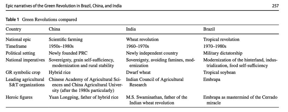 ... (read more)Nice table from the paper Epic narratives of the Green Revolution in Brazil, China, and India by Lídia Cabral, Poonam Pandey, and Xiuli Xu (2022):