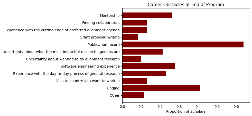 Similarly to last summer’s program, publication record was the career obstacle faced by more scholars than any other. While funding was the second-highest obstacle, we can see that challenges with writing grant proposals decreased dramatically, making it the least important obstacle for alumni leaving our Winter program, and indicating that grant writing is not a primary obstacle for obtaining funding. We attribute this improvement to the updated Research Plan milestone, designed around the LTFF grant application, and associated theory of change and grant application workshops. Additionally, the Strategy Discussion Groups might have helped scholars write theories of change.