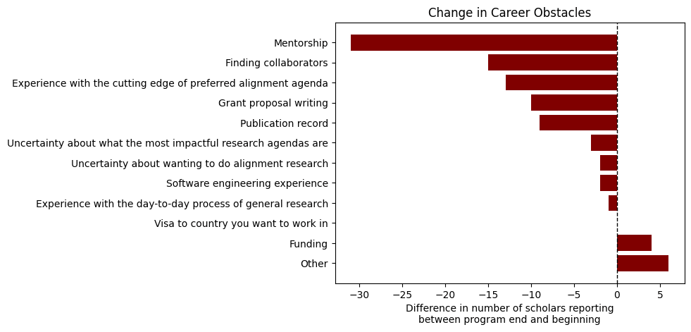 At the beginning and end of the program, scholars answered “What do you feel are the obstacles between you and a successful AI safety research career?” In aggregate, MATS reduced almost all barriers that scholars faced.