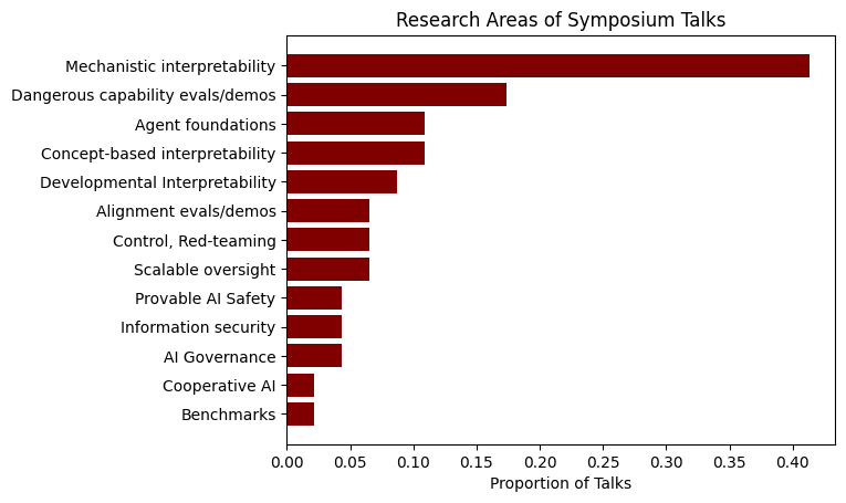 - 52% of presentations featured interpretability research, representing a significant proportion of the cohort’s research interests.