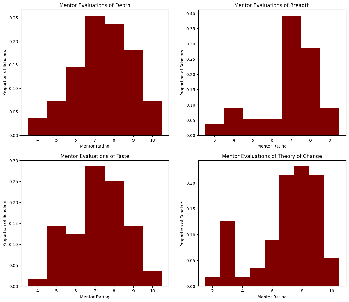 Halfway through the program, we asked mentors to evaluate their scholars on these same four dimensions. Average depth was 7.4/10, average breadth was 6.9/10, average taste was 7.2/10, and average theory of change was 7.0/10.