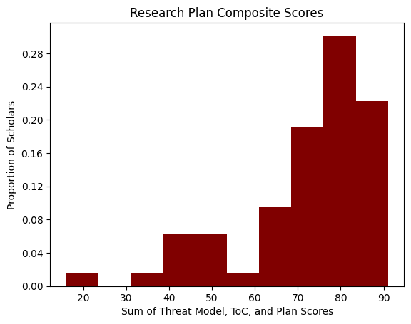 The median scores on the three respective sections were 15/20 points, 32/40 points, and 32/40 points. The median overall score was 76/100 points, showing that most scholars can effectively formulate and present a research plan.