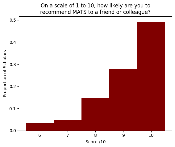 - Scholars are highly likely to recommend MATS to a friend or colleague (average likelihood is 9.2/10 and NPS is +74).