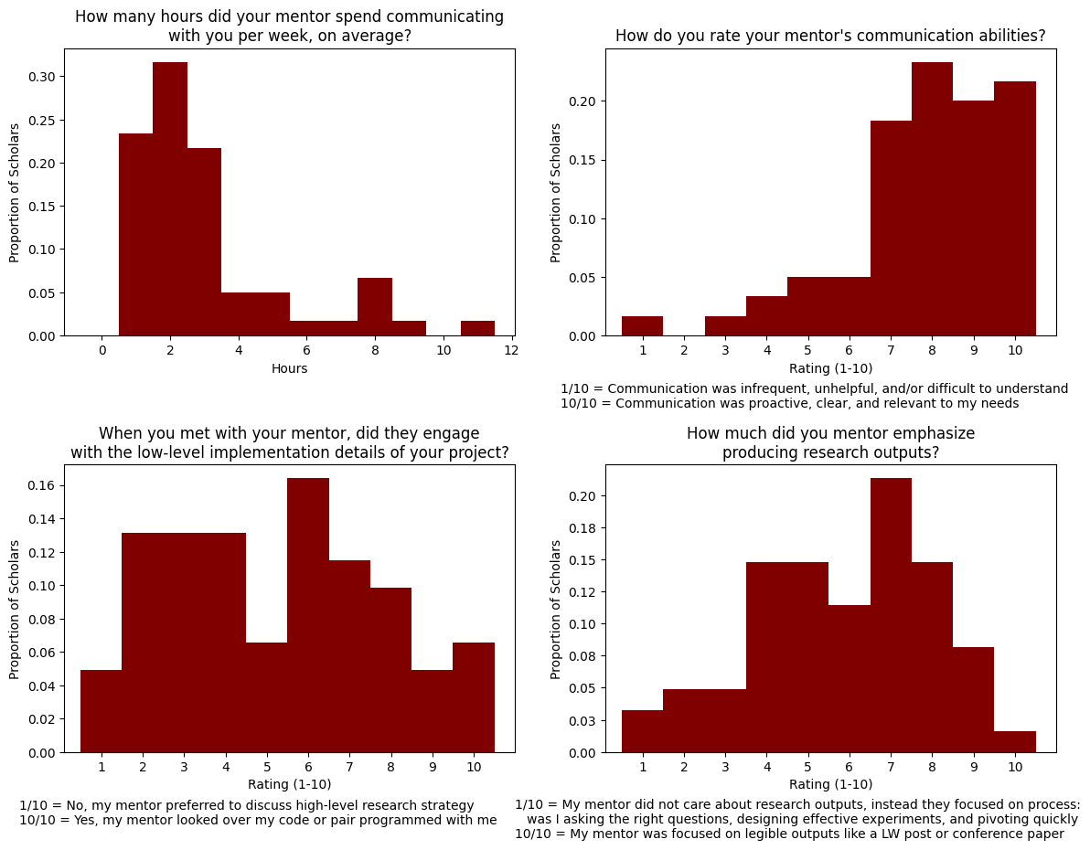 - Mentors were enthusiastic for scholars to continue their research, rating the average scholar 8.1/10, on a scale where 10 represented “Very strongly believe scholar should receive support to continue research.”