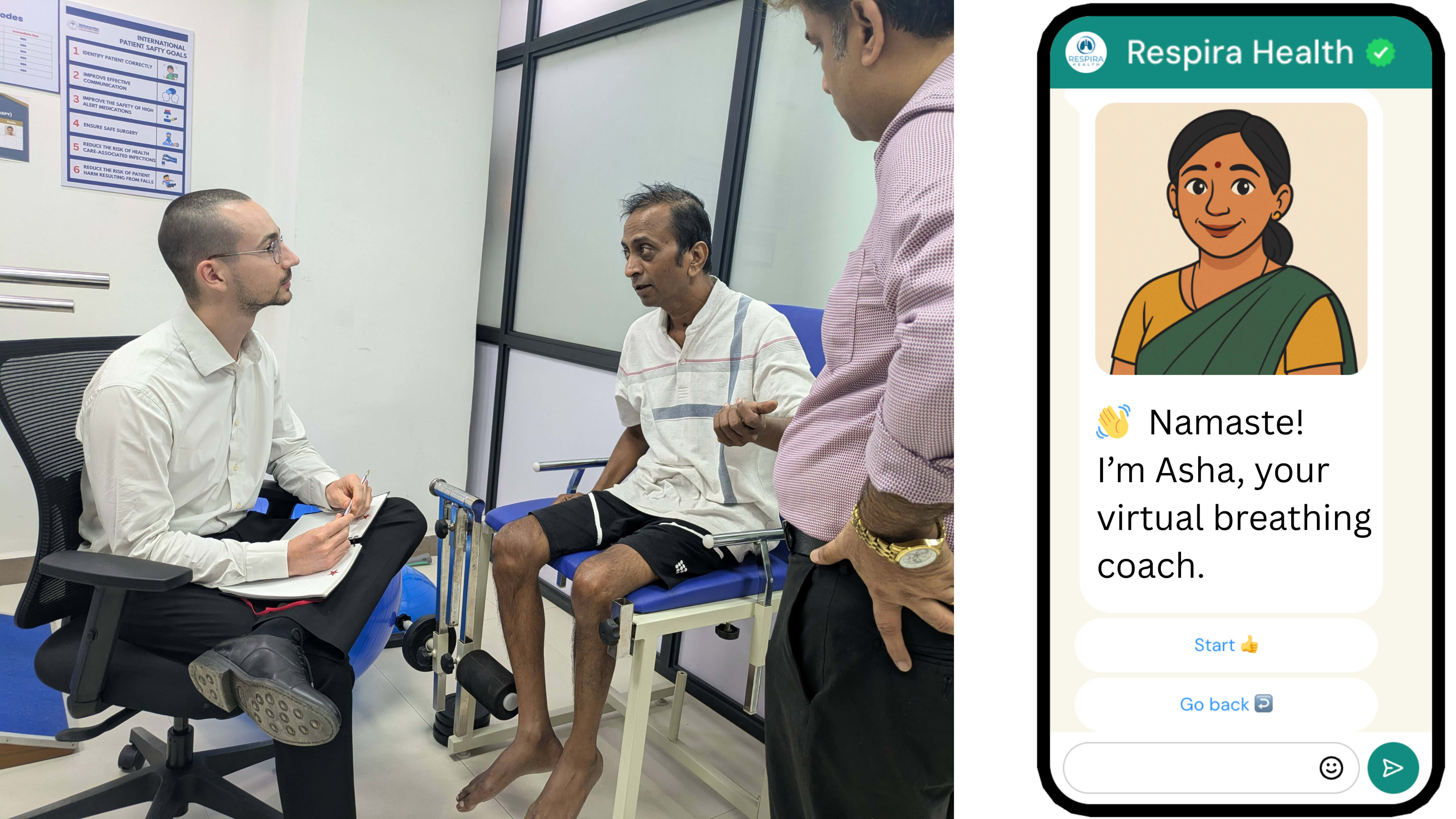 L: Rowan interviews a COPD patient in a PR clinic in Mumbai. R: An example of our English Whatsapp chatbot interface