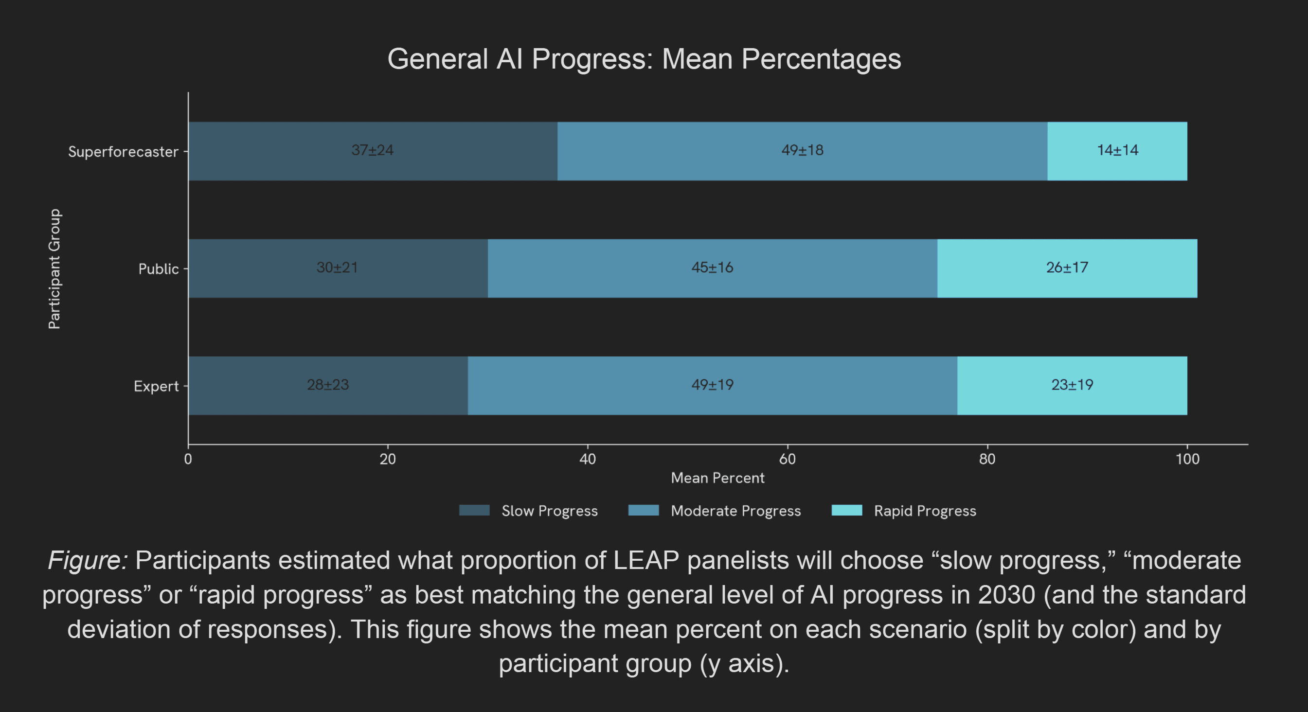 At the end of 2030, what percent of LEAP panelists will choose “slow progress,” “moderate progress,” or “rapid progress” as best matching the general level of AI progress?