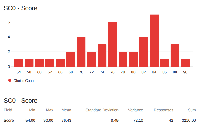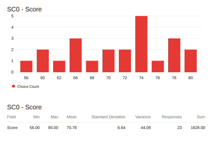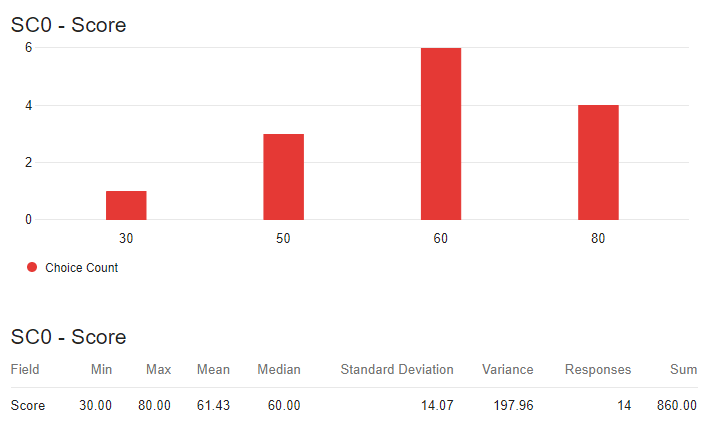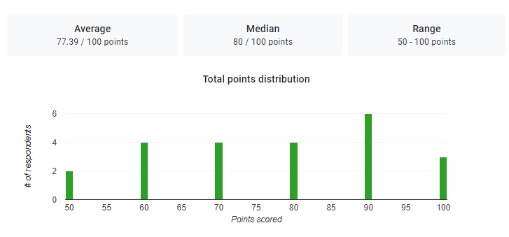 Survey 1 had a lower mean than survey 2 (61.43 vs. 77.39), as well as a lower median score (60 vs. 80). The mode of survey 2 was also much higher (90 vs. 60). Visually, survey 2 also seems to have a higher standard deviation - the results were more spread out - and a much larger range. This was perhaps due to the larger sample size (24 vs. 14). However, the large differences in score visible in all these measures of central tendency indicate a pretty reliable trend: the average points earned by group 2 were larger than group 1. All in all, there was a correlation between the relationship of group 1 and group 2 scores for survey 1 and survey 2, meaning survey 2 seems to have been a successful measure of scout mindset (or at least thought patterns related to the scout mindset). Moreover, there was a significant divide between the responses of the two groups for many of the conditional reasoning questions, and a much greater proportion of people in group 1 seemed to be picking the non scout mindset answers than in group 2. This is promising, since it means that the question design was effective to some extent - it achieved the differentiation I was hoping for.