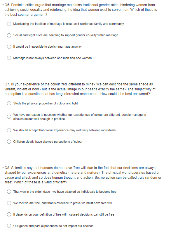 Designing these questions was a challenge, since each begins with the introduction of a new idea or theory and I had to take the perspective of people with different mindsets/biases. It was difficult to phrase the questions in a way that would enable the participants to understand the concepts as quickly as possible and be able to reason through an answer to the question. This involved another pilot study which involved me making a lot of changes, as I asked people who were unfamiliar with the ideas and had to adapt a few of the sentences to make them easier to follow. The questions I ended up with were structured like the example I presented earlier - two spoof answers, one from the perspective of someone without Scout Mindset and one from the perspective of someone with Scout Mindset. Both of the latter were inductively logical.