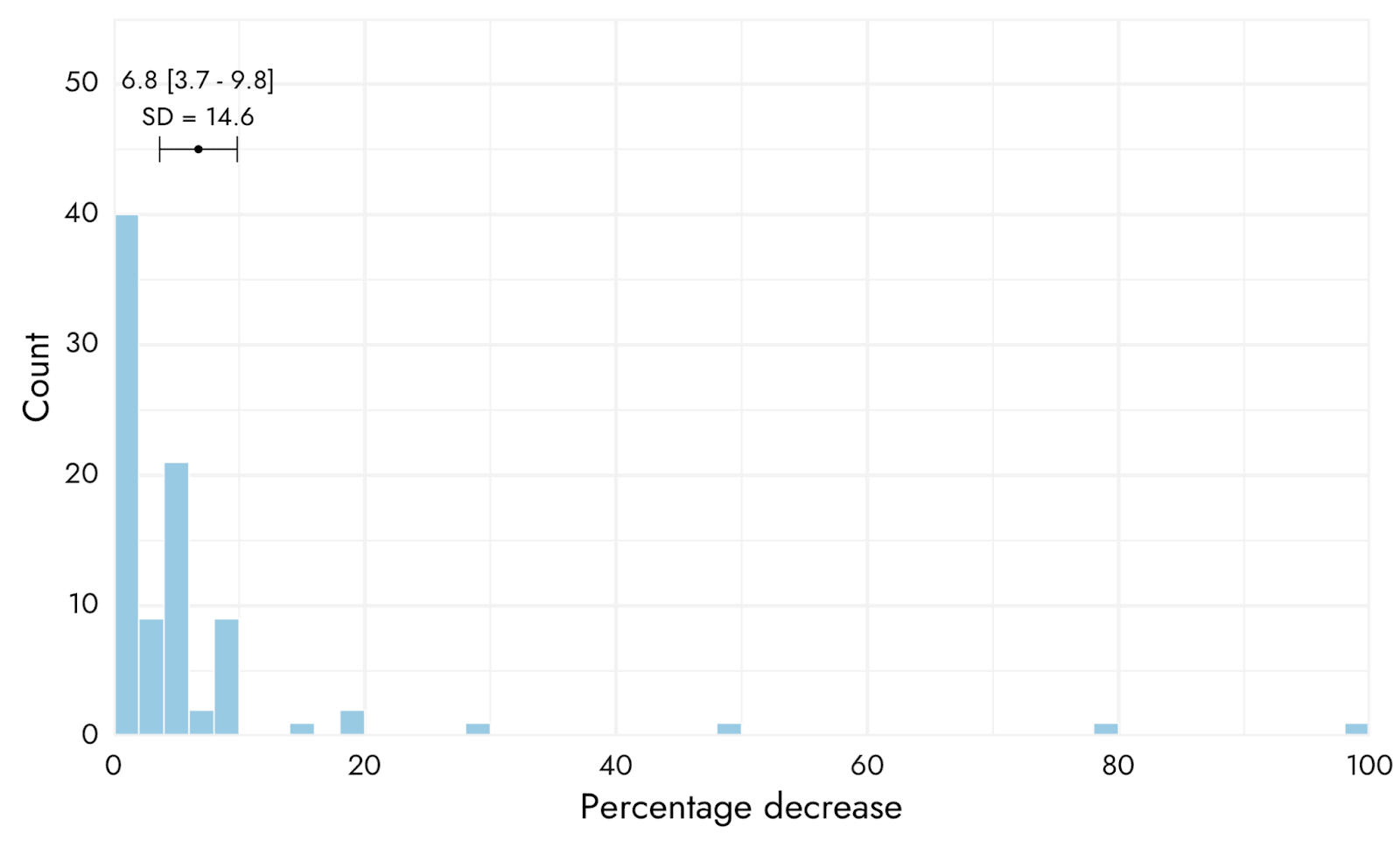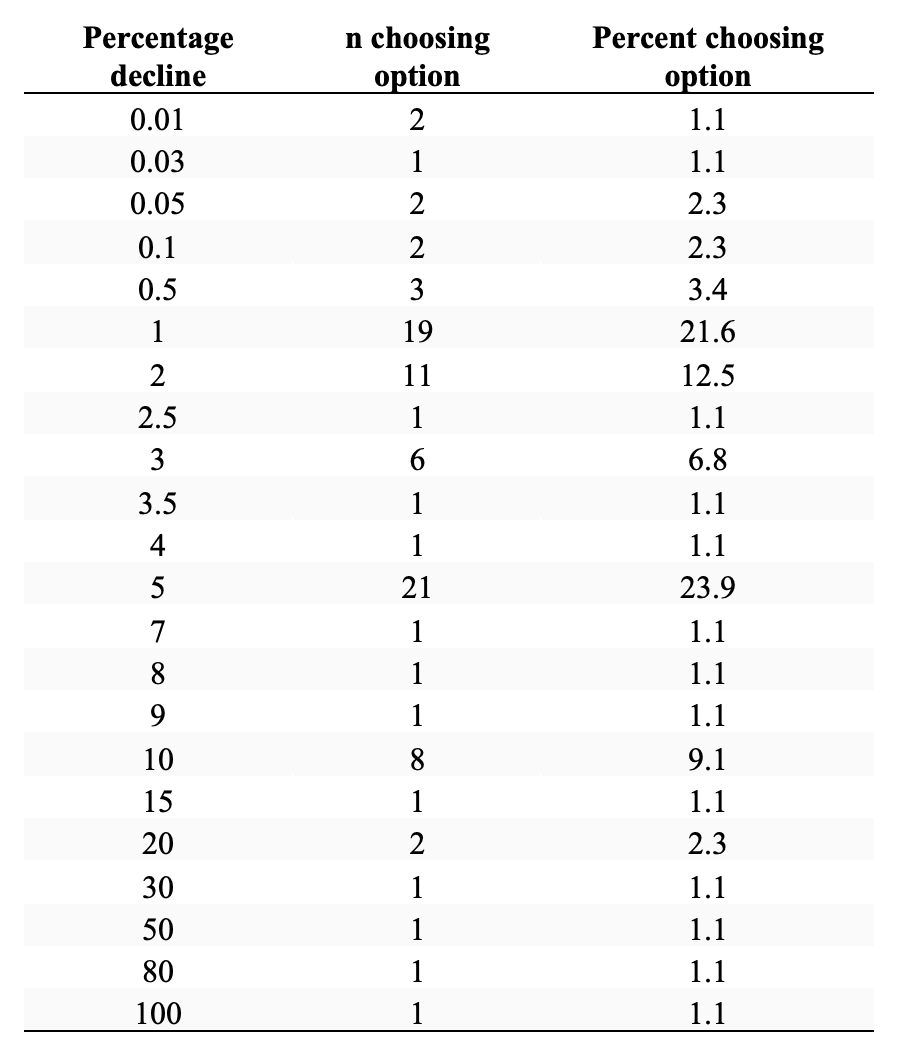 Within those who reported preferring to help people now, we received 88 responses that provided a specific percentage of decay per year. The two plots below show, firstly, the number of people giving different percentage values, and secondly, the cumulative probability of giving different percentages. Over 50% of these respondents had a value at or less than 5%, and 90% of people reported a percentage decline of 10% or less. However, there was substantial variation. A handful of people reported very high percentages such as 80% or 100%. The mean of the distribution was 6.8, with the single most endorsed percentage decline being 5% (n = 21), followed by 1% (n = 19).