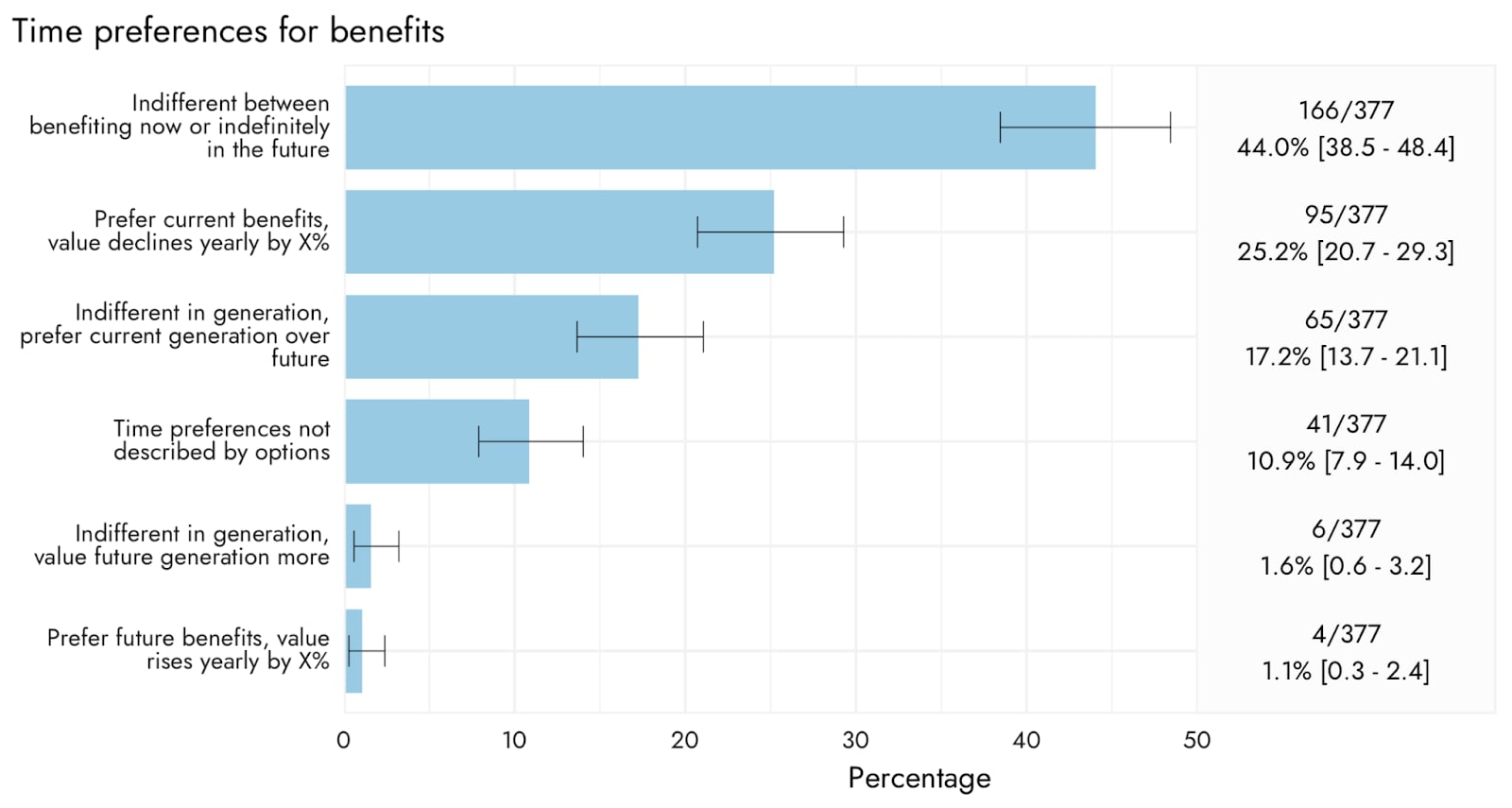 The most endorsed attitude (44%) was to be roughly indifferent between benefiting someone today relative to indefinitely far in the future. This was followed by preferring to help current people, with a specified ‘decay’ of value into the future (endorsed by 25% of respondents). A further 17% reported being indifferent with respect to time when helping within a generation of people, but preferring helping the current generation of people more than future generations. Finally, 11% of respondents reported that none of the specified attitudes matched their preferences. All other views received less than 2% endorsement.