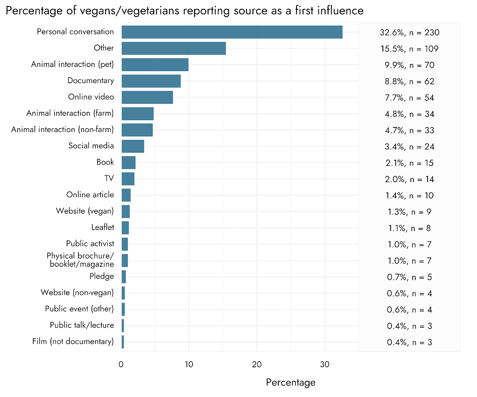 We also found that documentaries were reported to be among the most common factors that first influenced people to adopt a vegetarian or vegan diet, and as being generally reported as highly influential on respondents' decisions.