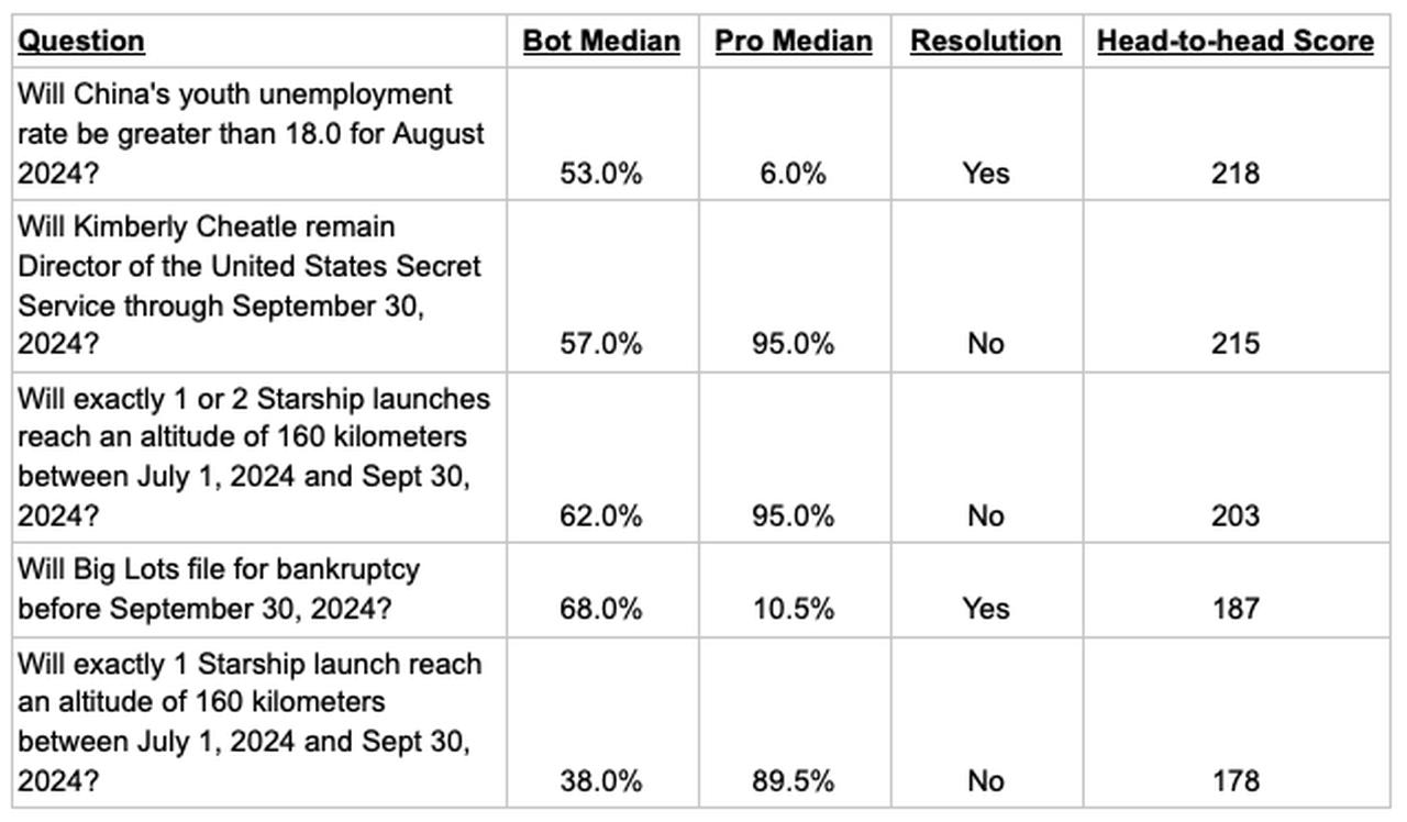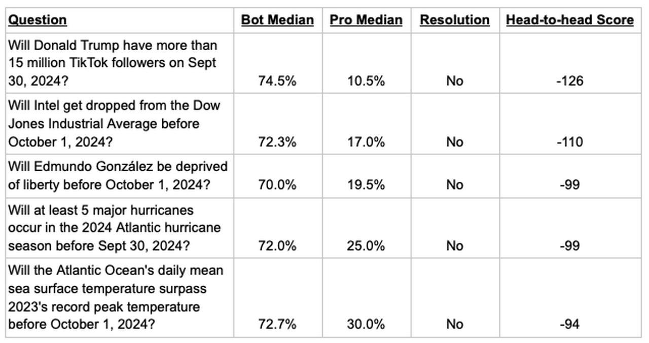 Interestingly, the bots' worst Head-to-head scores didn’t occur on questions they were extremely confident on. Instead, their forecasts were between 70% and 75% on their 5 worst scoring questions, but the Pros were much lower and the questions all resolved No.
