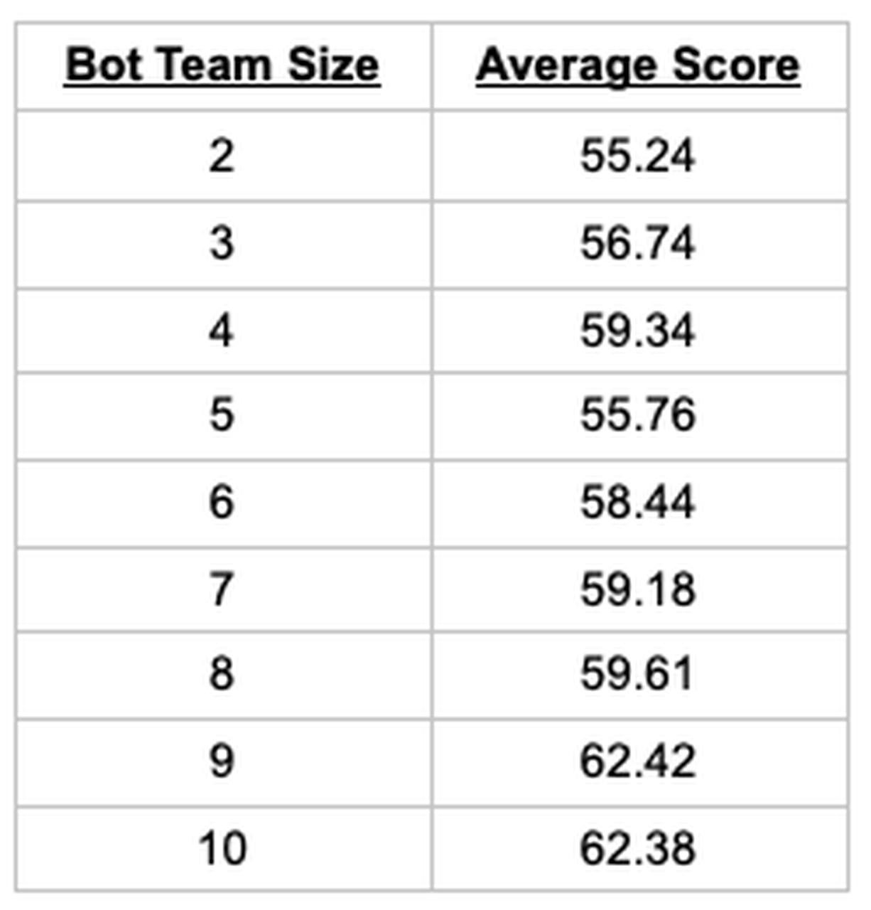 Following our methodology, we selected a 9 bot team since it had the best score.