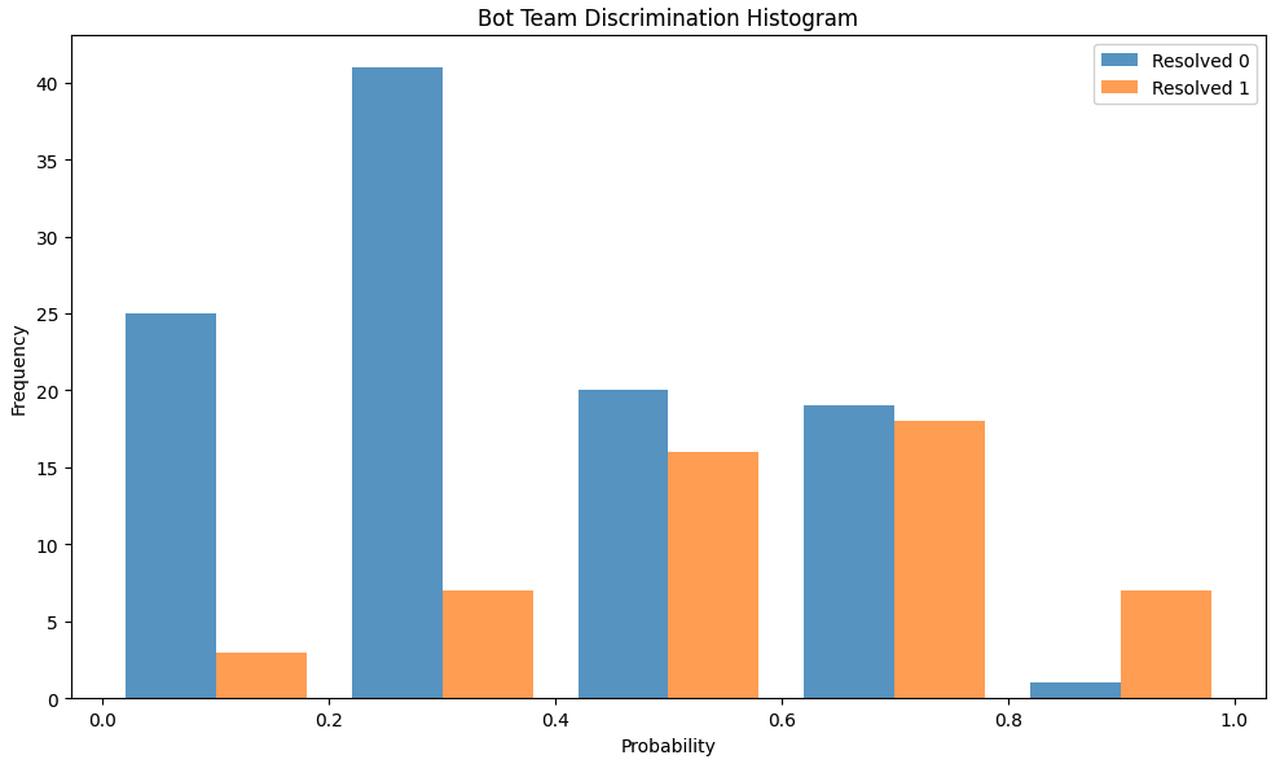 We can see that the Pros forecast well below 50% on the questions that resolved No (blue bars), and slightly over 50% on questions that resolved Yes (orange bars). The Pros’ average forecast on questions that resolved Yes was 36 percentage points higher compared to their forecasts on questions that resolved No. A similar plot for the bots paints a very different story.