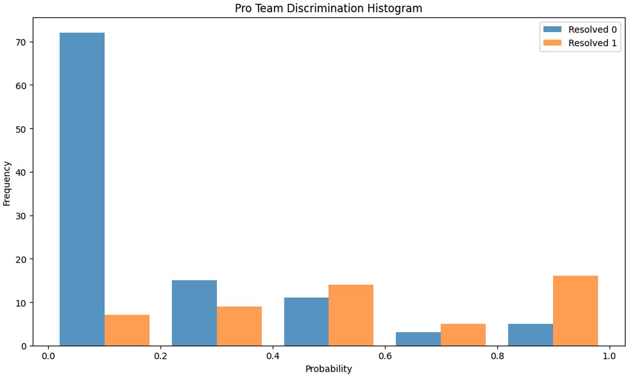 The figure below shows an unweighted histogram of the Pros’ forecasts for questions that resolved Yes in orange and No in blue.