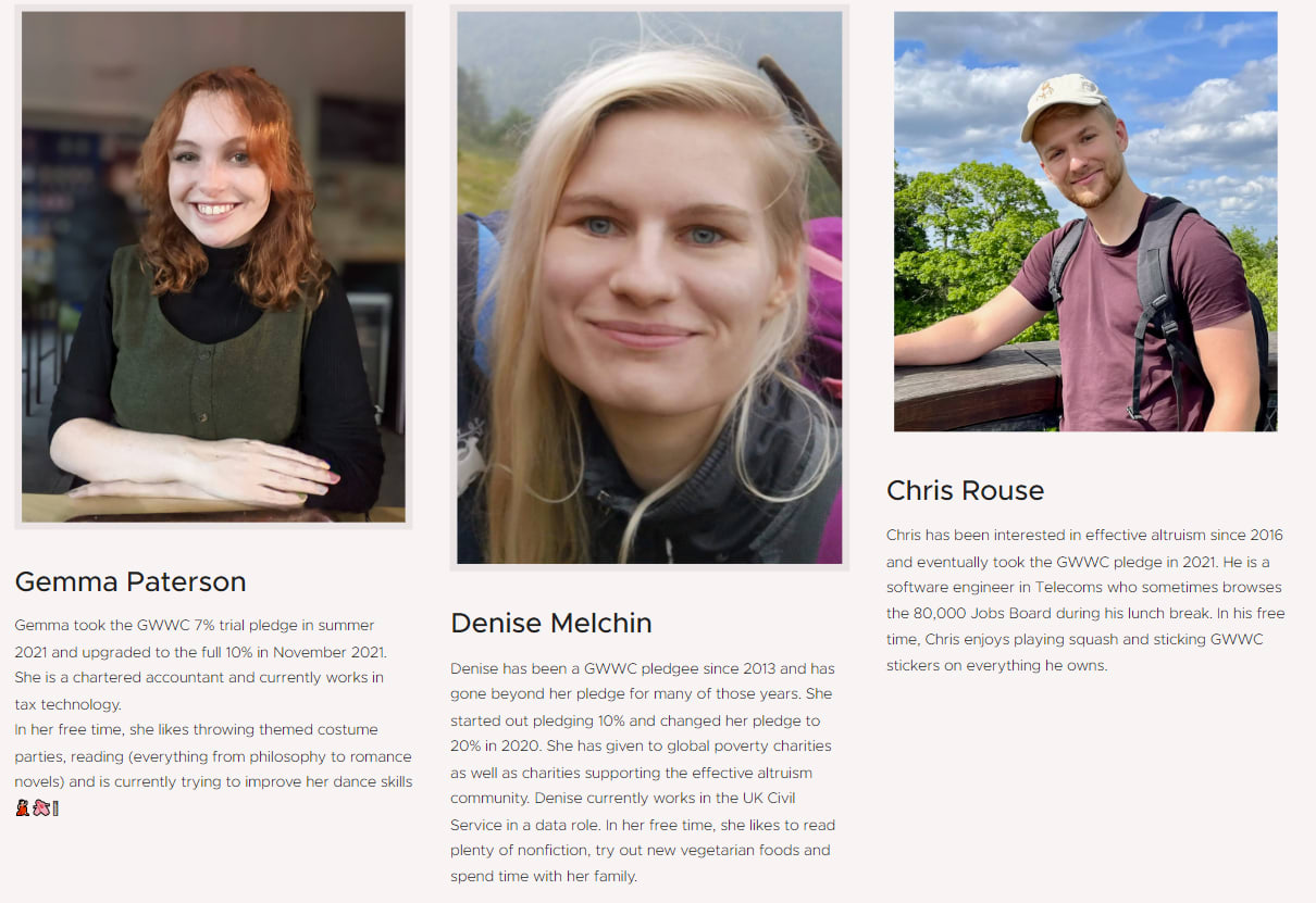 We (Gemma Paterson, Denise Melchin and Chris Rouse), are all volunteers with non-EA day jobs who are keen to help achieve GWWC’s mission of making giving effectively and significantly a cultural norm.